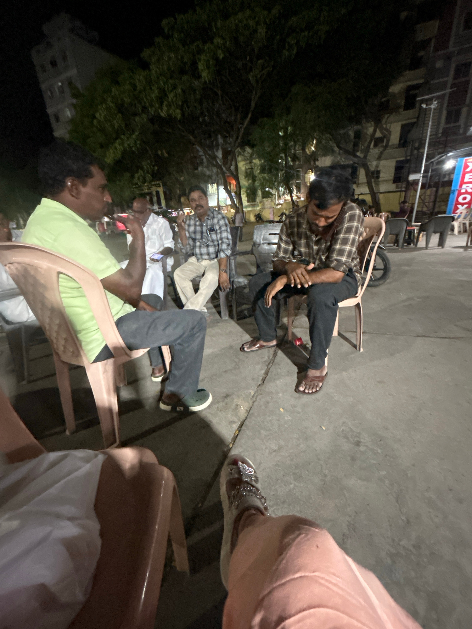 The image depicts a group of men sitting on chairs in an outdoor setting in Puttaparthi, India. One man wears a plaid shirt and dark pants and sits with his legs crossed. Another man wears a green shi…read more