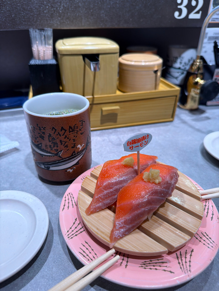 Two pieces of salmon nigiri adorn a wooden platform atop a pink patterned plate, accompanied by chopsticks. Beside it, a brown mug featuring Japanese script and a fish illustration sits near a small w…read more