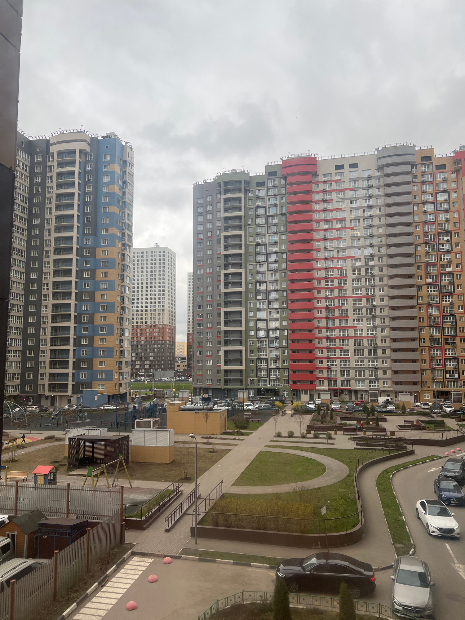 The image depicts a view of residential buildings in Khimki, Russia. The buildings are tall, multi-storied structures with a variety of colors on the facades, including blue, grey, red, and beige. Eac…read more