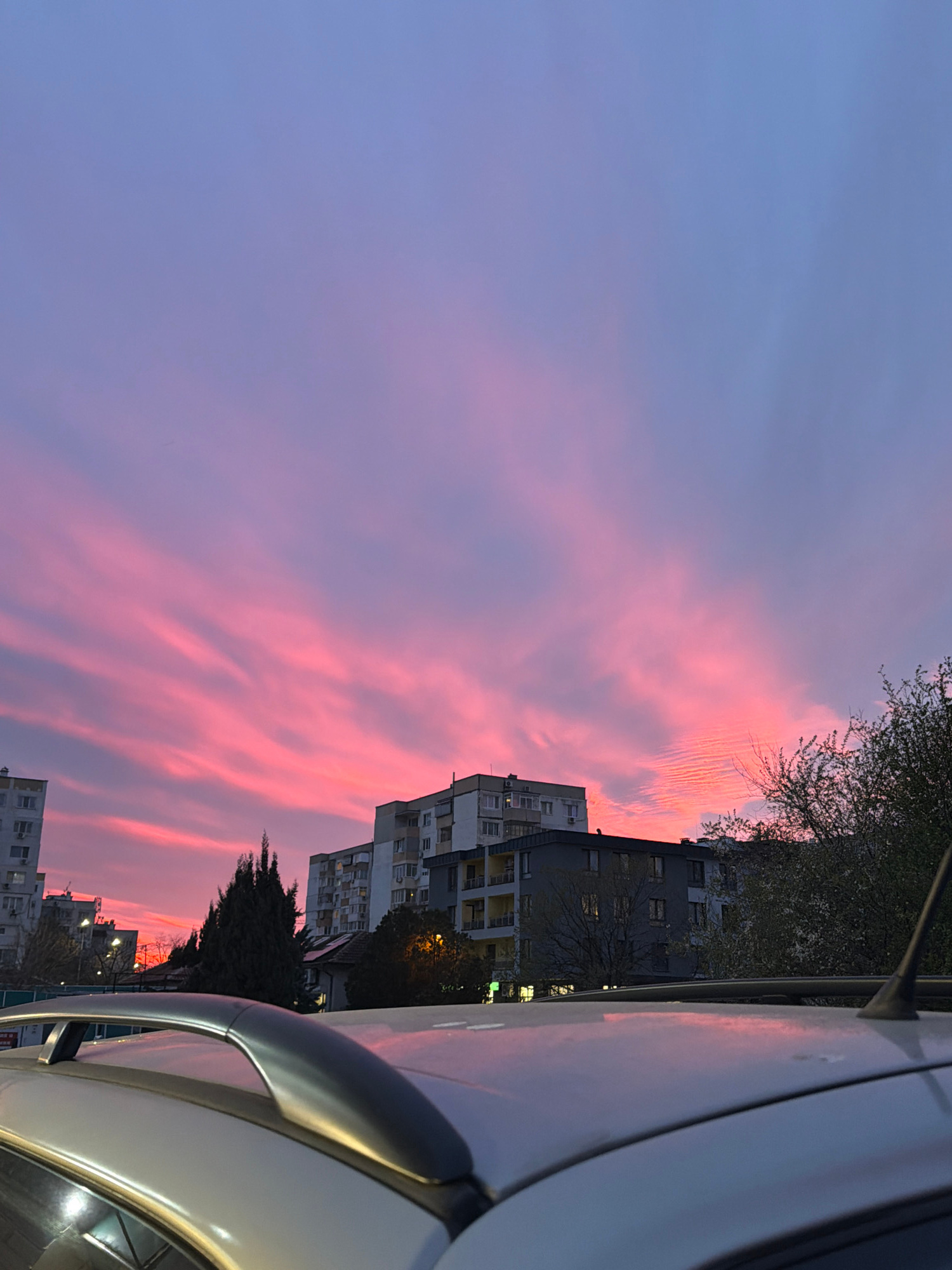 The image captures a vibrant sunset in Varna, Bulgaria. The sky transitions from blue to pink, with striated clouds illuminated by the setting sun. The foreground includes a partial view of a white ca…read more