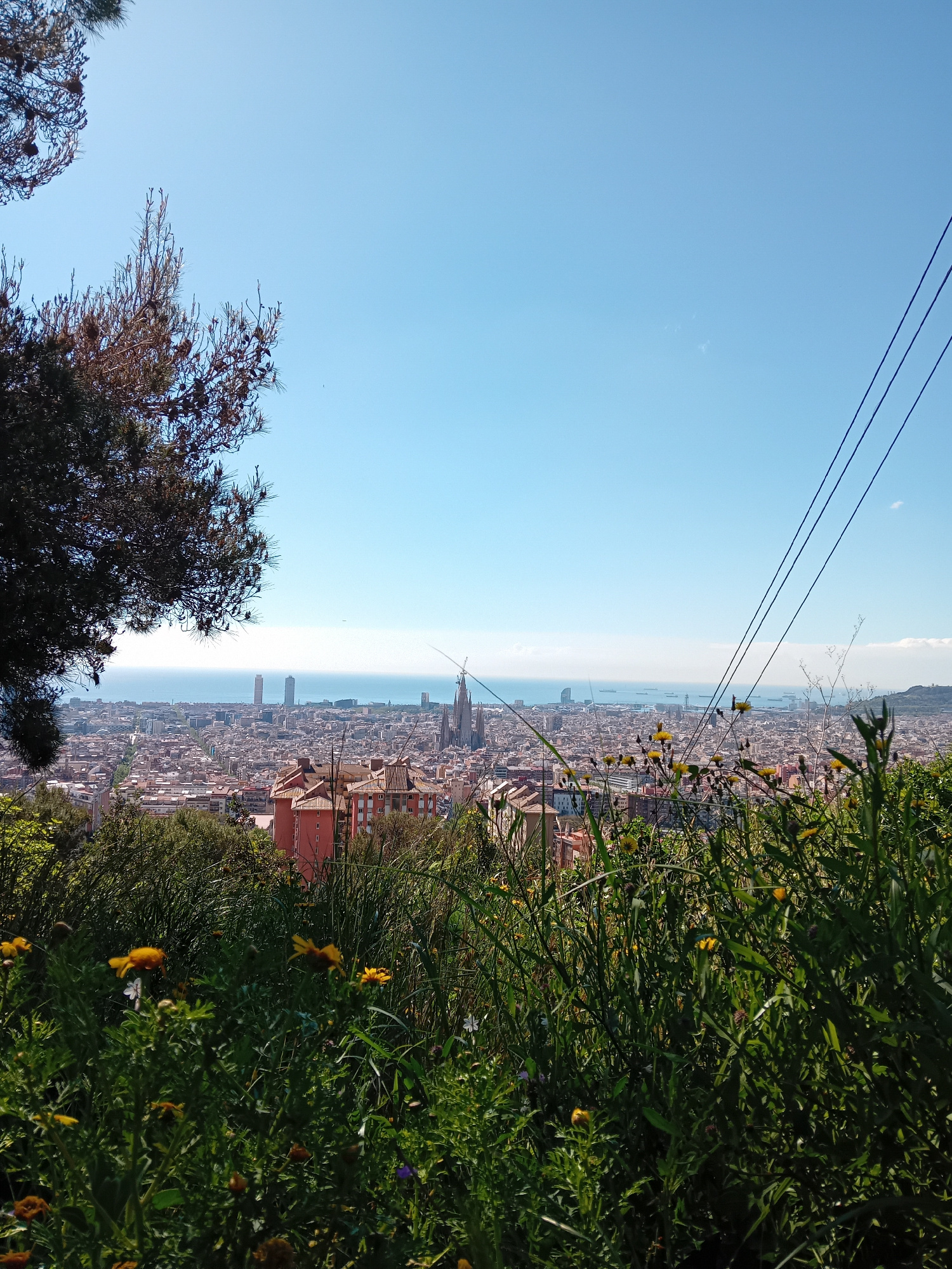 The image depicts a high-angle, slightly askew view of Barcelona, Spain, looking towards the Mediterranean Sea. The clear blue sky occupies the upper left portion of the frame. In the middle ground, t…read more