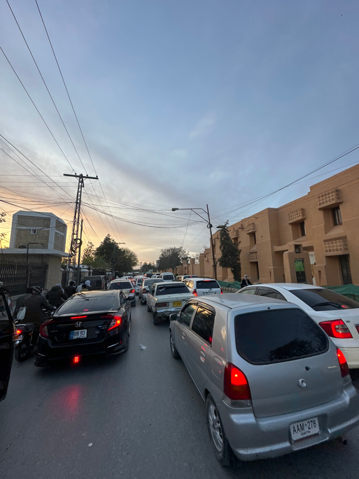 The image depicts an urban street in Quetta City Tehsil, Pakistan, at dusk, characterized by heavy traffic congestion. The sky exhibits a gradient from orange and pink near the horizon to light blue o…read more
