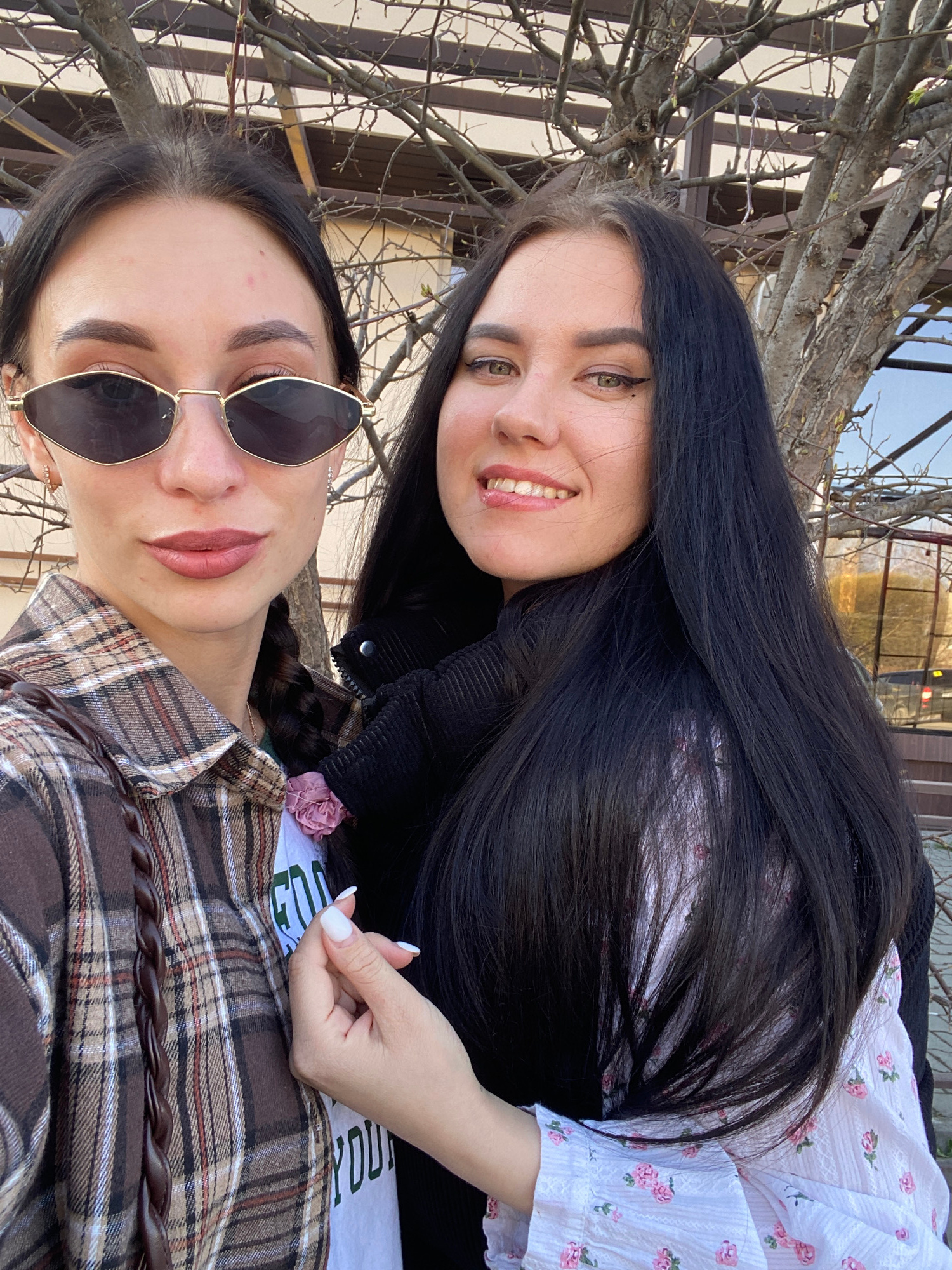 Two women are posing outdoors. The woman in the foreground is wearing sunglasses and a brown plaid shirt. The woman in the background has long, dark hair and is wearing a white floral top. They are po…read more