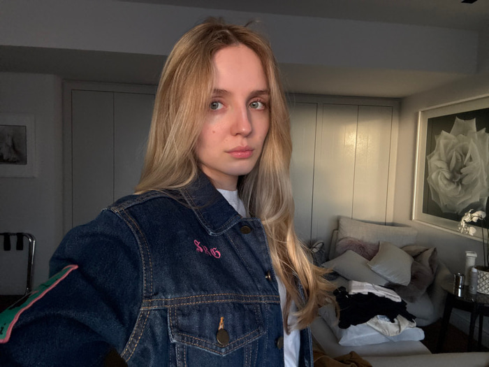 A young adult female with long, wavy blonde hair and light eyes is positioned in the foreground, facing slightly left of the camera, looking directly forward. She wears a dark denim jacket featuring p…read more