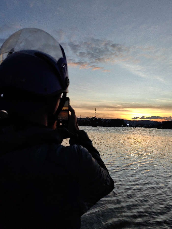 The image depicts a single individual, viewed from behind and rendered in silhouette, standing beside a body of water, likely Xuan Huong Lake in Da Lat, Vietnam, during sunset. The person is wearing a…read more