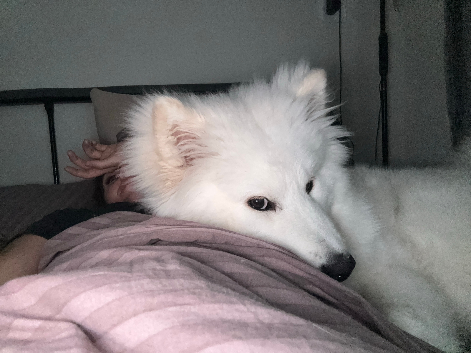 A white Samoyed dog is lying on or next to a bed with a pink and white striped blanket. A human hand is visible near the dog's head. The location is likely indoors, as suggested by the presence of the…read more