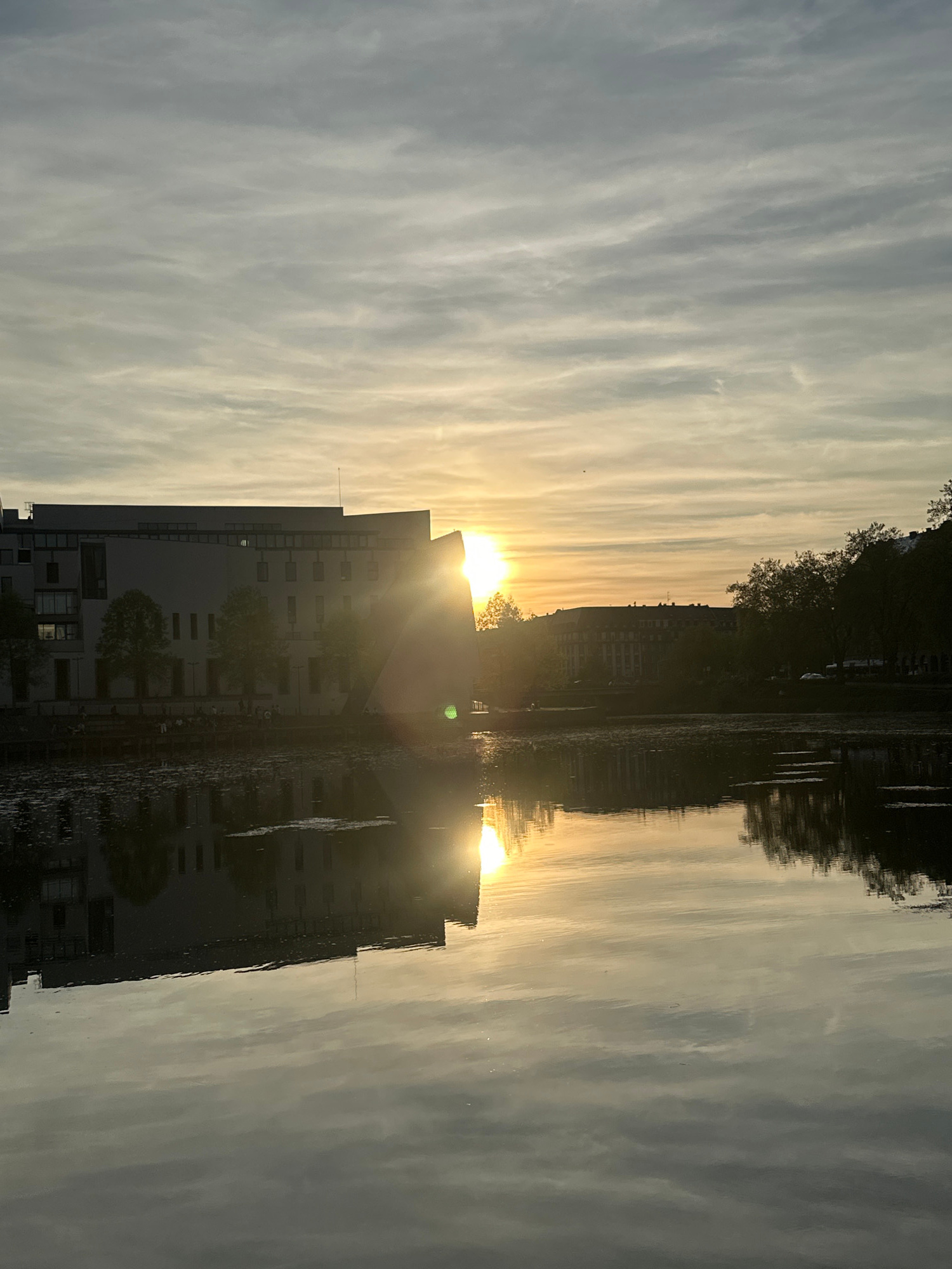 The image shows the reflection of a tall building and the sky in water. The building is a modern, multi-story structure with a unique roofline, possibly in Strasbourg, France. The sun is positioned di…read more