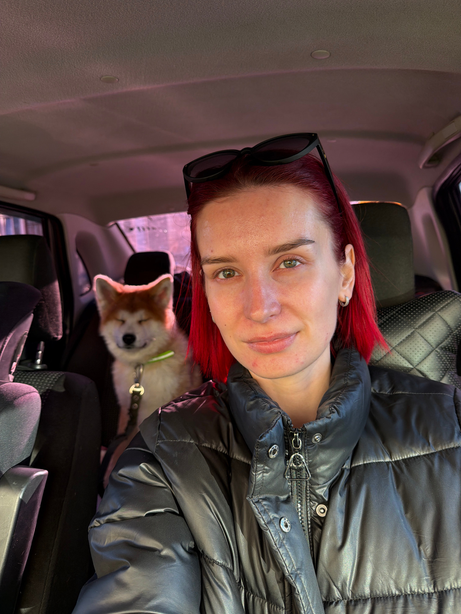 A young woman with striking red hair and green eyes is captured in a close-up photo inside a vehicle. She has fair skin with some minor blemishes and a slight, friendly smile, looking directly at the…read more