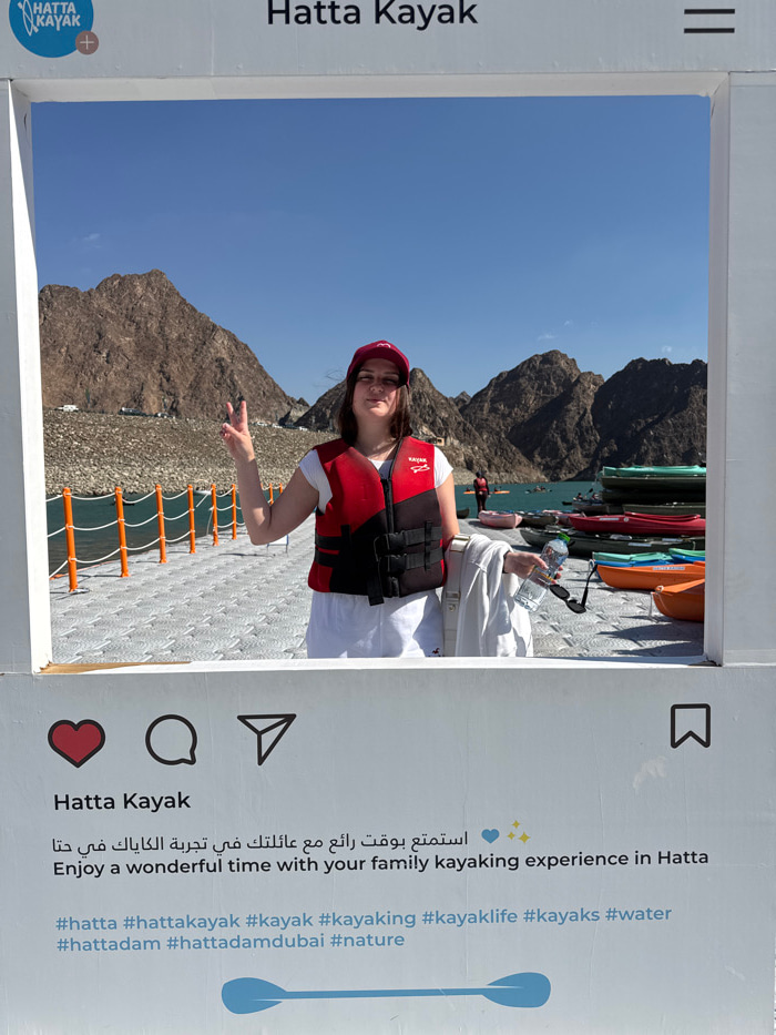 The image depicts an outdoor recreational scene at Hatta Kayak, located at the Hatta Dam in the city of Hatta, United Arab Emirates, characterized by a mountainous desert landscape and a large turquoi…read more