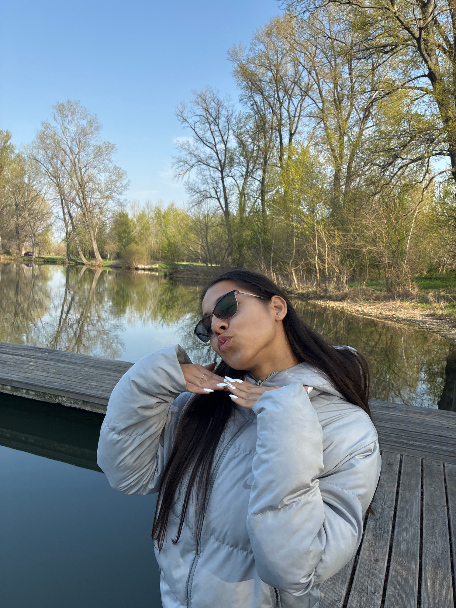 A young woman wearing a light-grey padded jacket and sunglasses is standing on a wooden bridge in Septemvri, Bulgaria. She has long dark hair and white manicured nails, and is pursing her lips. The ba…read more