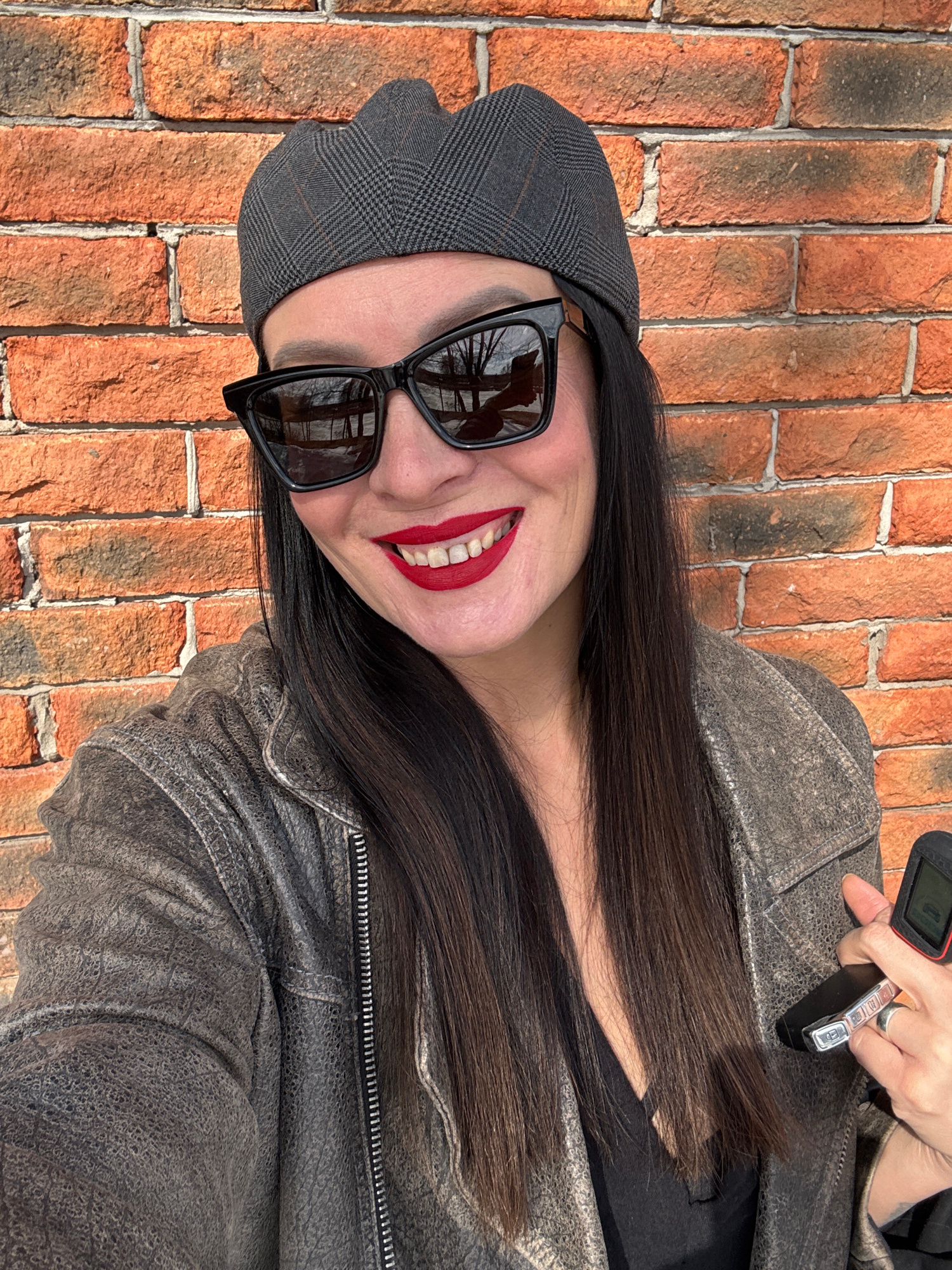 A woman is facing the camera wearing a dark gray newsboy cap, black sunglasses, and bright red lipstick. She has long, dark hair. She is wearing a distressed gray leather jacket. In her hand, she hold…read more