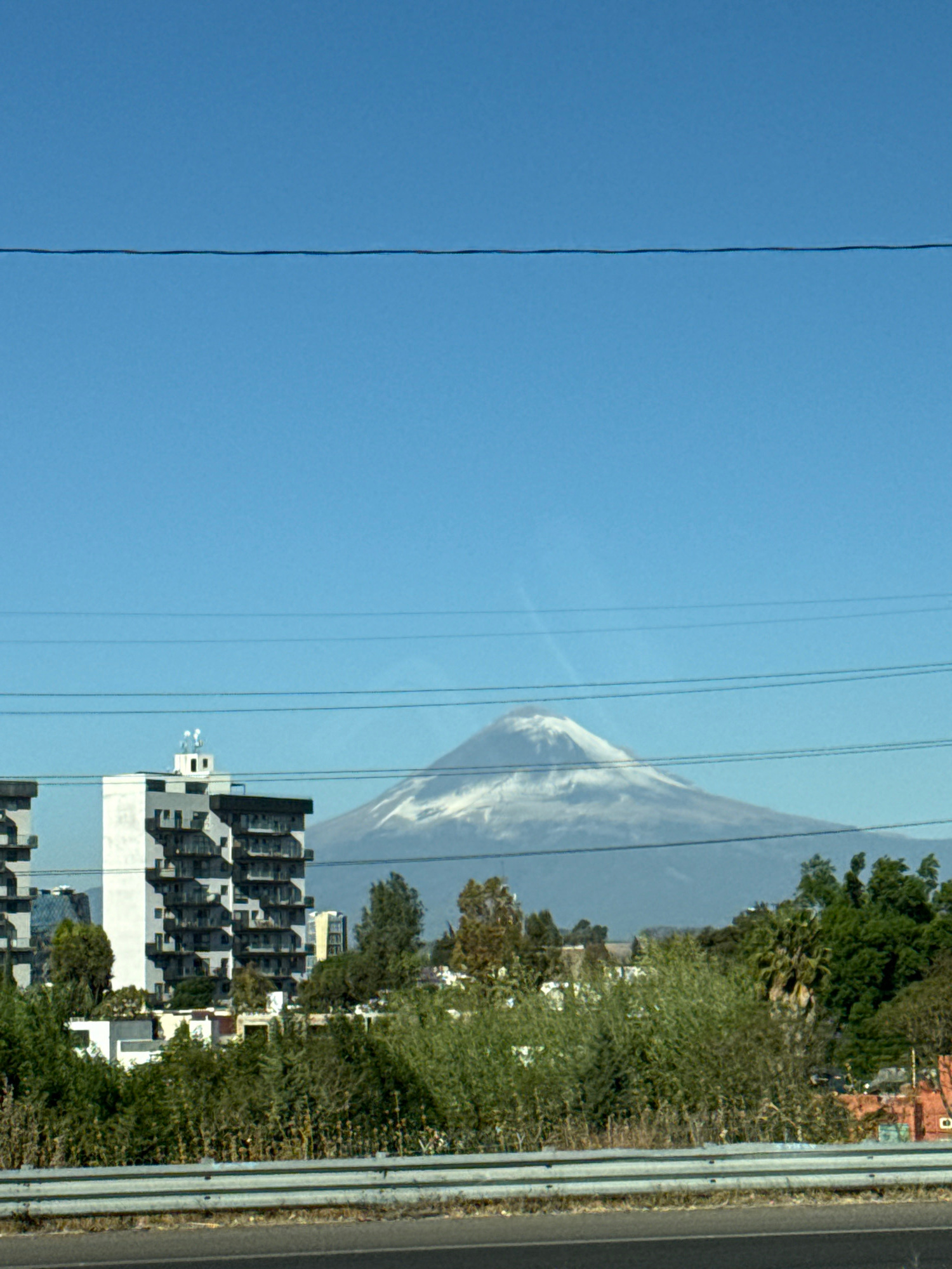 This image presents a daytime view of an urban and natural landscape in San Pedro Cholula, Mexico. In the immediate foreground, a dark asphalt road surface is visible, topped by a two-bar, silver-colo…read more