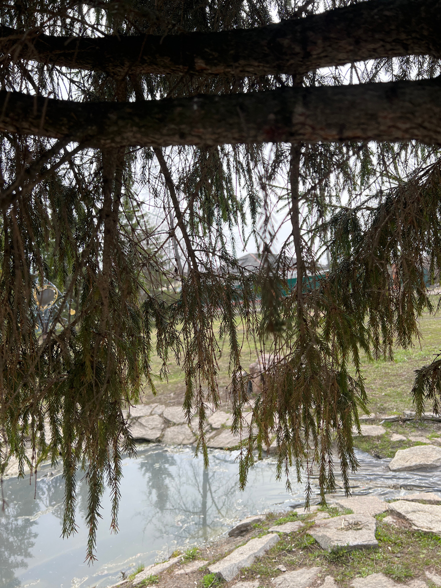 The image captures a scene at the edge of a body of water, possibly a pond or canal, in what appears to be a park or green space. The foreground is dominated by the trunks and branches of evergreen tr…read more
