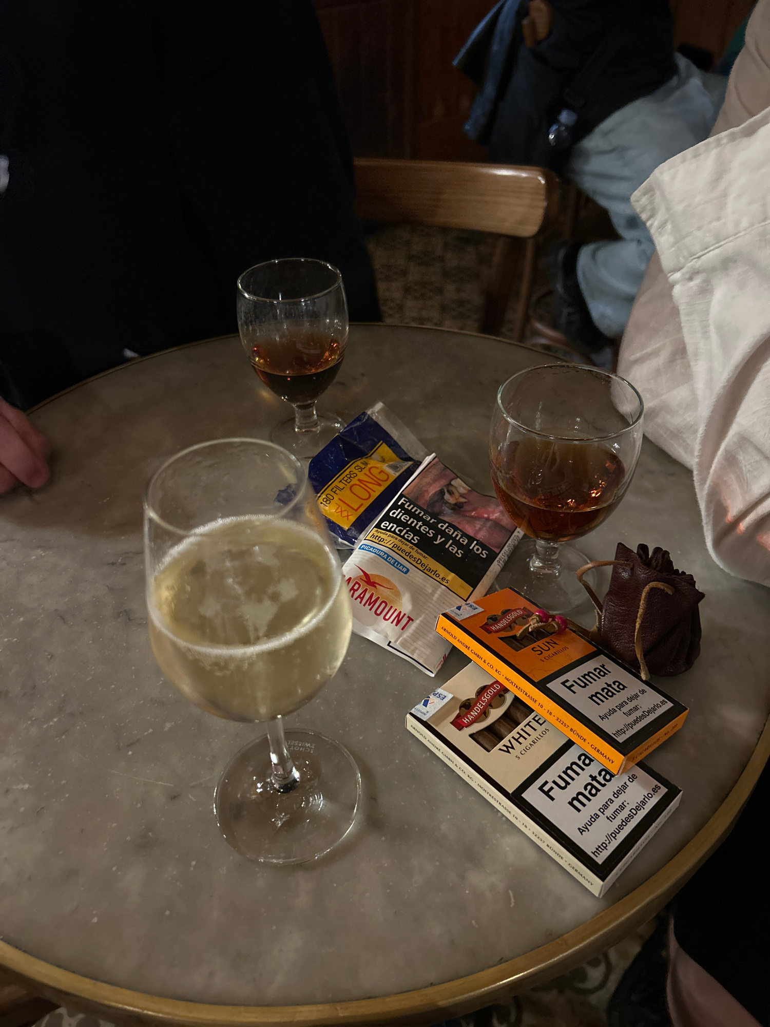 The image shows a top-down view of a round marble table with a gold trim, cluttered with various items. There are three glasses of different sizes and shapes, two containing amber-colored liquids, pre…read more
