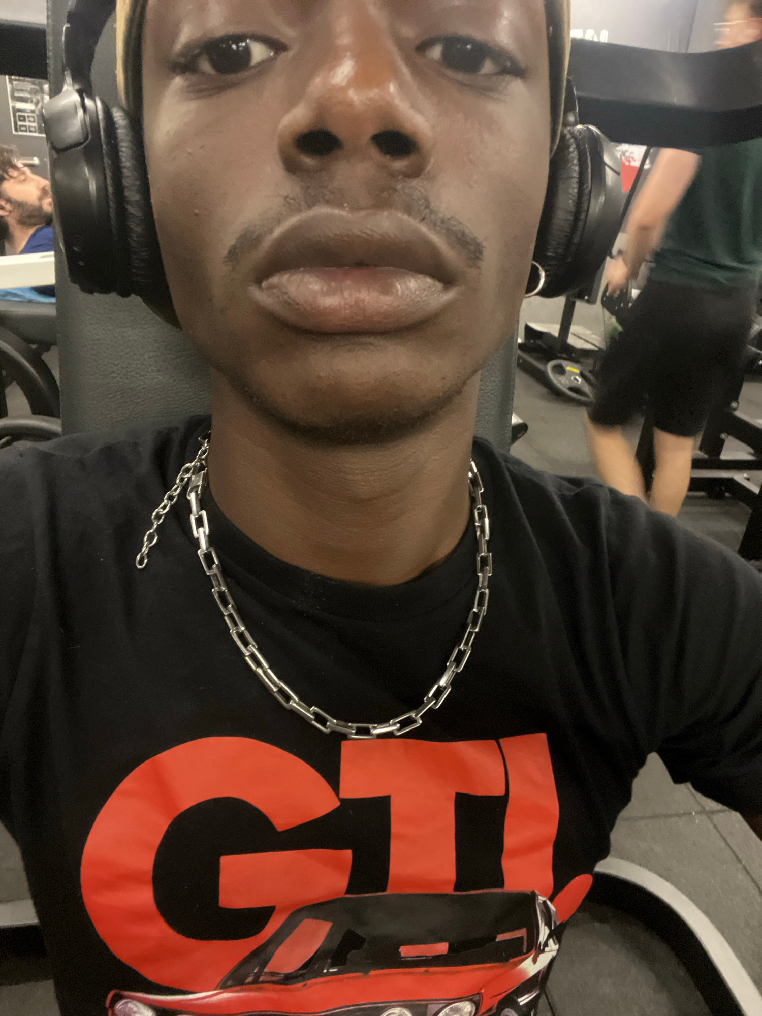 A close-up, tilted-angle photograph depicts a man, presumably in a gym setting. He is wearing headphones around his neck and a silver chain. His black t-shirt features a prominent red "GTI" design. Th…read more