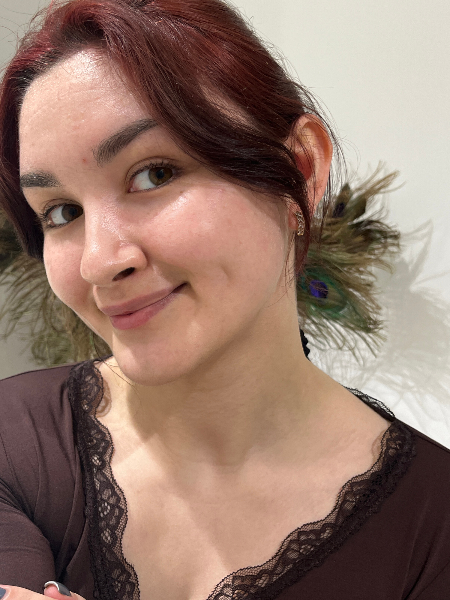 An image taken in Neftekamsk, Russia, depicts a young adult female from the chest up, positioned slightly to the right of the frame's center. She possesses fair skin, dark auburn hair parted on the le…read more