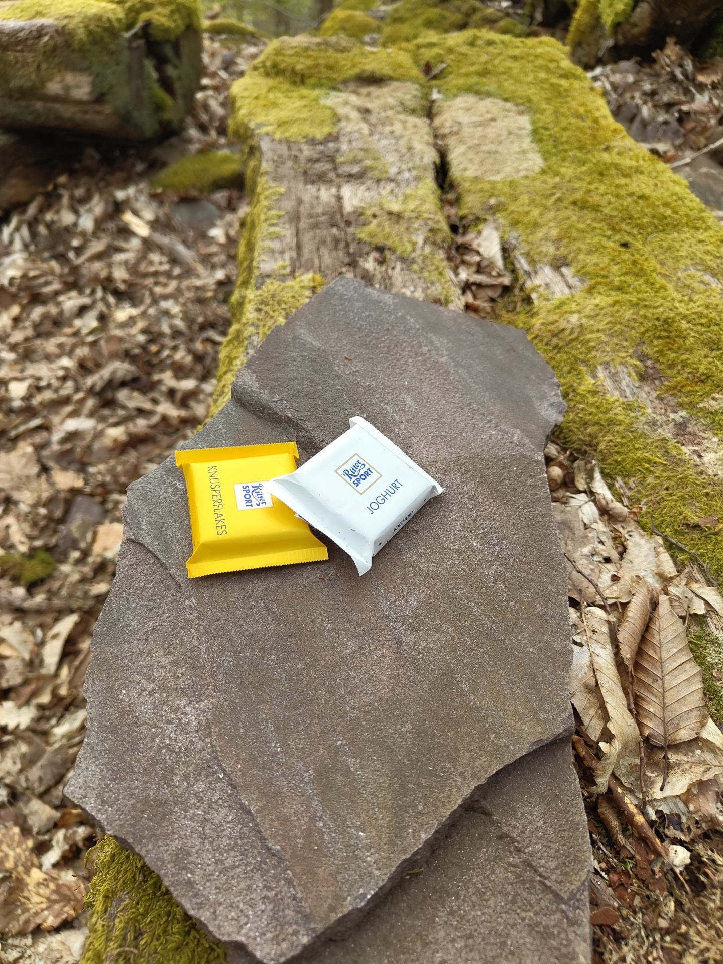 The image depicts a forest floor environment in Mettlach, Germany. A large, dark gray stone with a rough texture sits among fallen leaves and moss-covered tree trunks. Two wrappers of Ritter Sport cho…read more