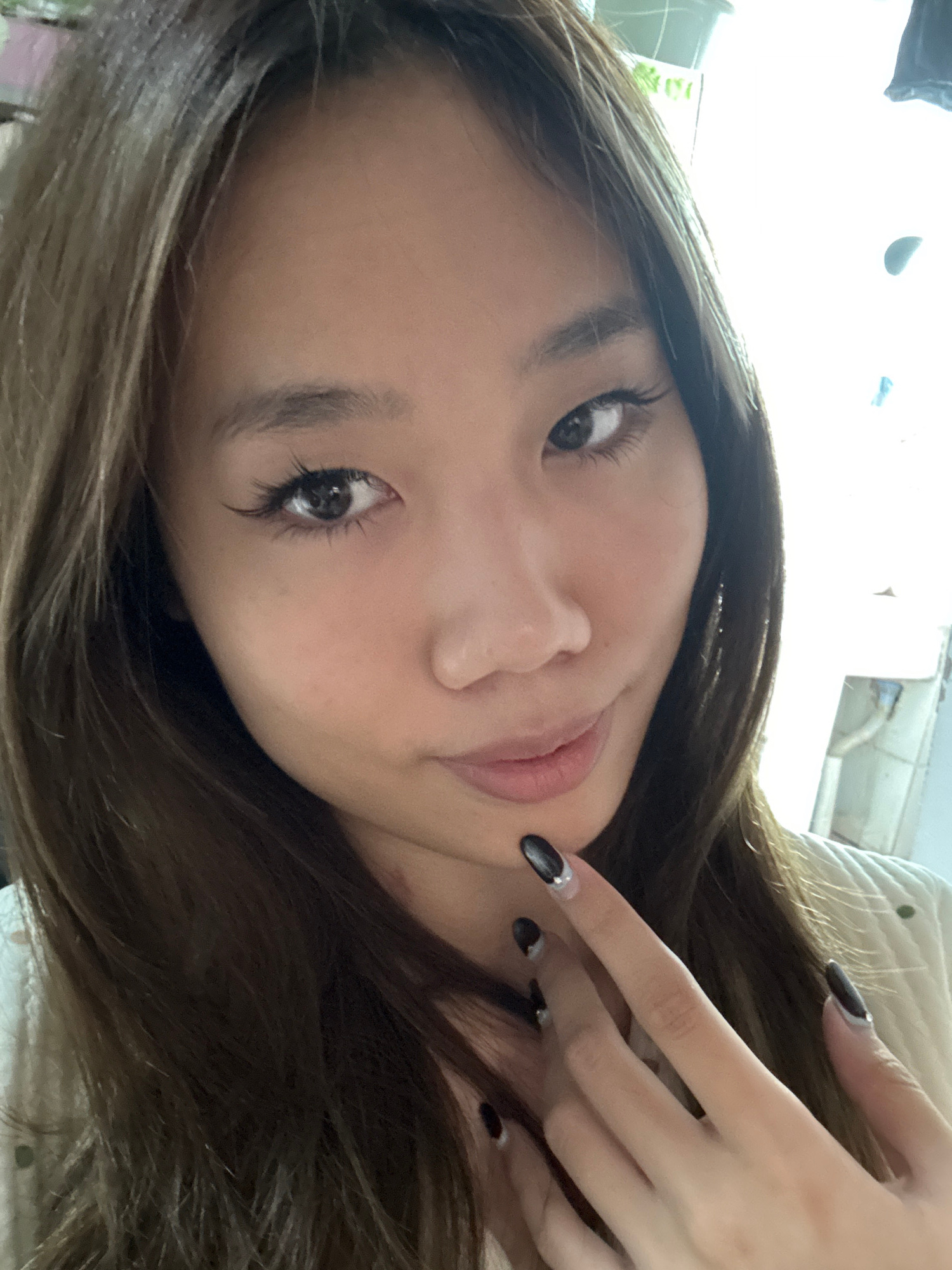 A young woman with long brown hair is shown in a close-up selfie. She is looking directly at the camera with a slight smile. Her right hand is near her face, with painted fingernails that are black wi…read more