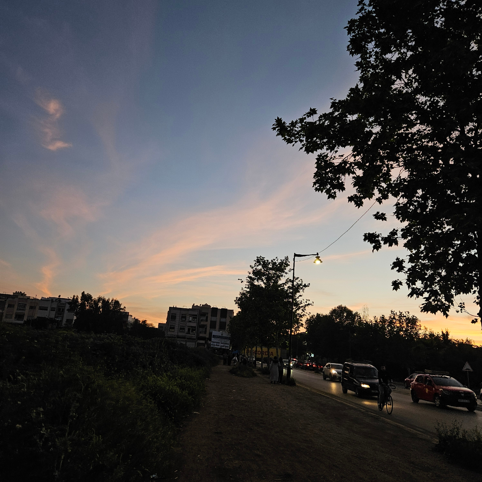 The image depicts an urban scene at dusk in Fez, Morocco. The sky transitions from a dark blue to orange hue, featuring wispy clouds. Silhouetted tree branches frame the top left of the image. A streeβ¦read more