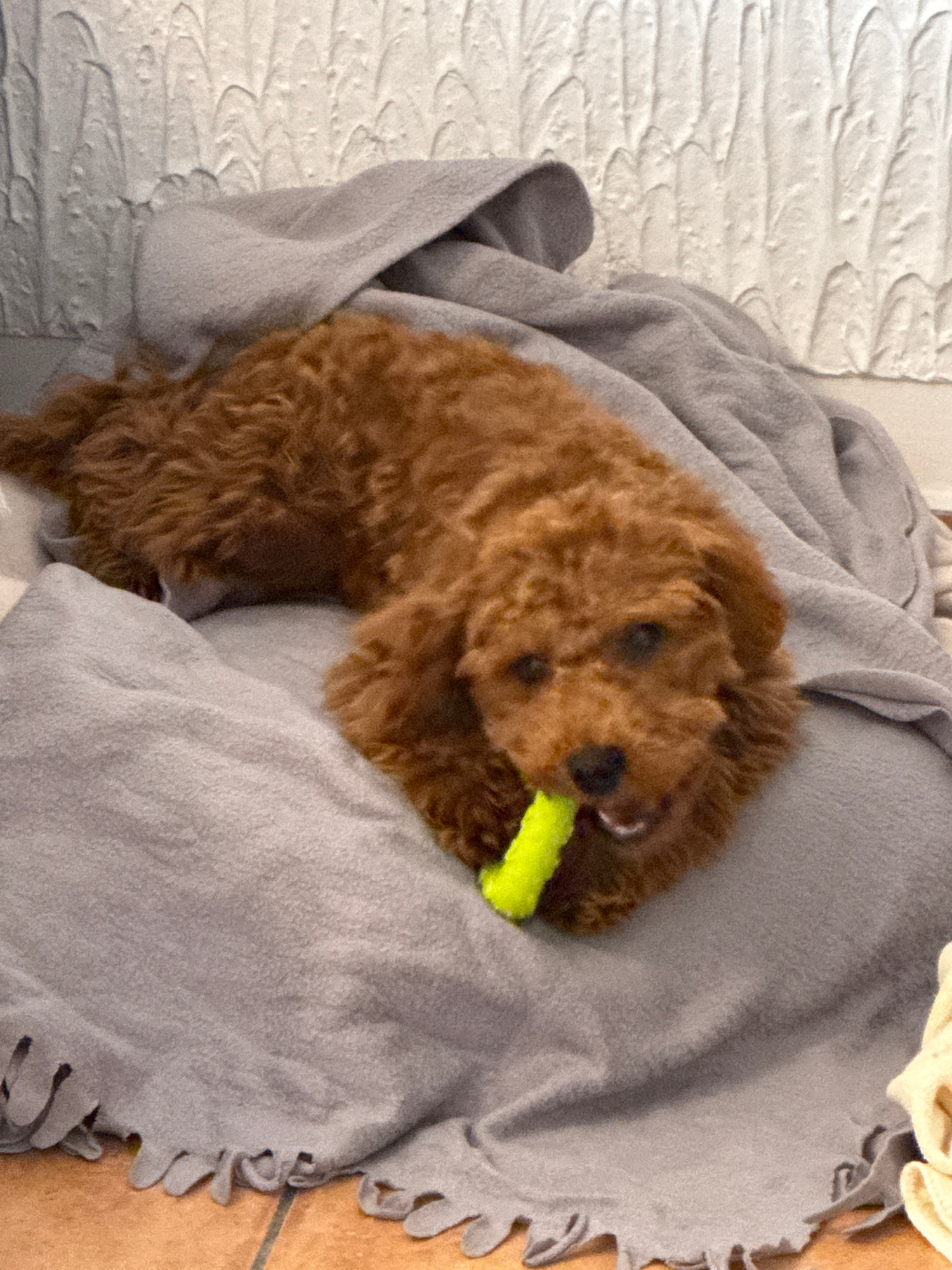 A brown poodle-type dog is lying on a gray blanket with a green toy in its mouth. The blanket is draped over what appears to be a white textured surface. The dog is positioned towards the upper center…read more