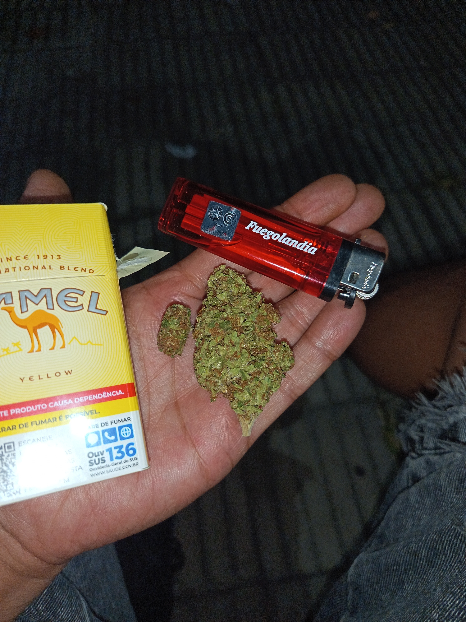 A hand holds two buds of cannabis, a red “Fuegolandia” lighter, and a yellow pack of Camel cigarettes. The cigarette pack states “Ouv SUS 136 Ouvidoria-Geral do SUS WWW.SAUDE.GOV.BR," indicating the p…read more