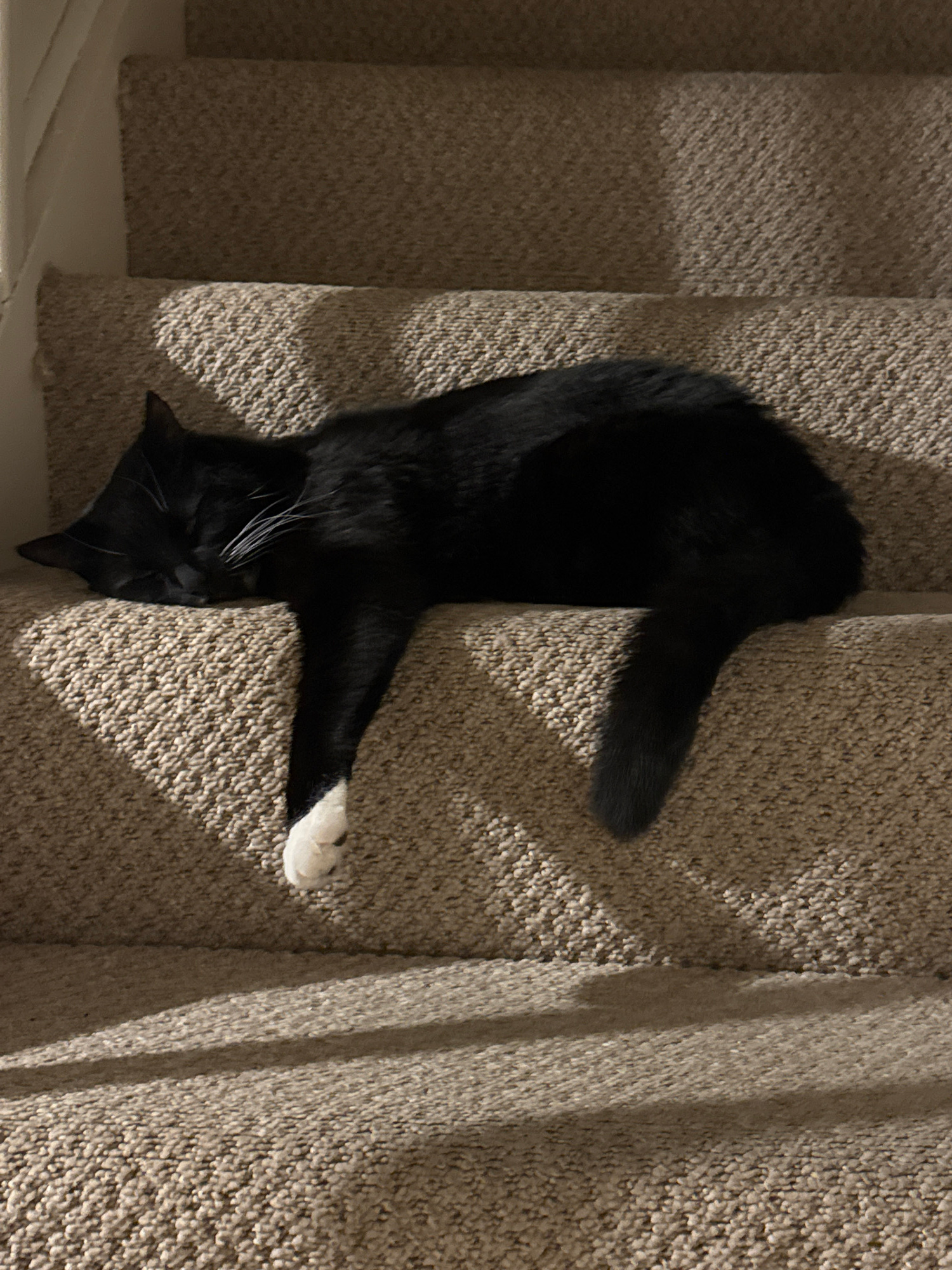 A black cat with a white paw lies diagonally across three carpeted steps. The location is likely a private residence within Desborough, United Kingdom, given the domestic setting and carpeted stairs.…read more