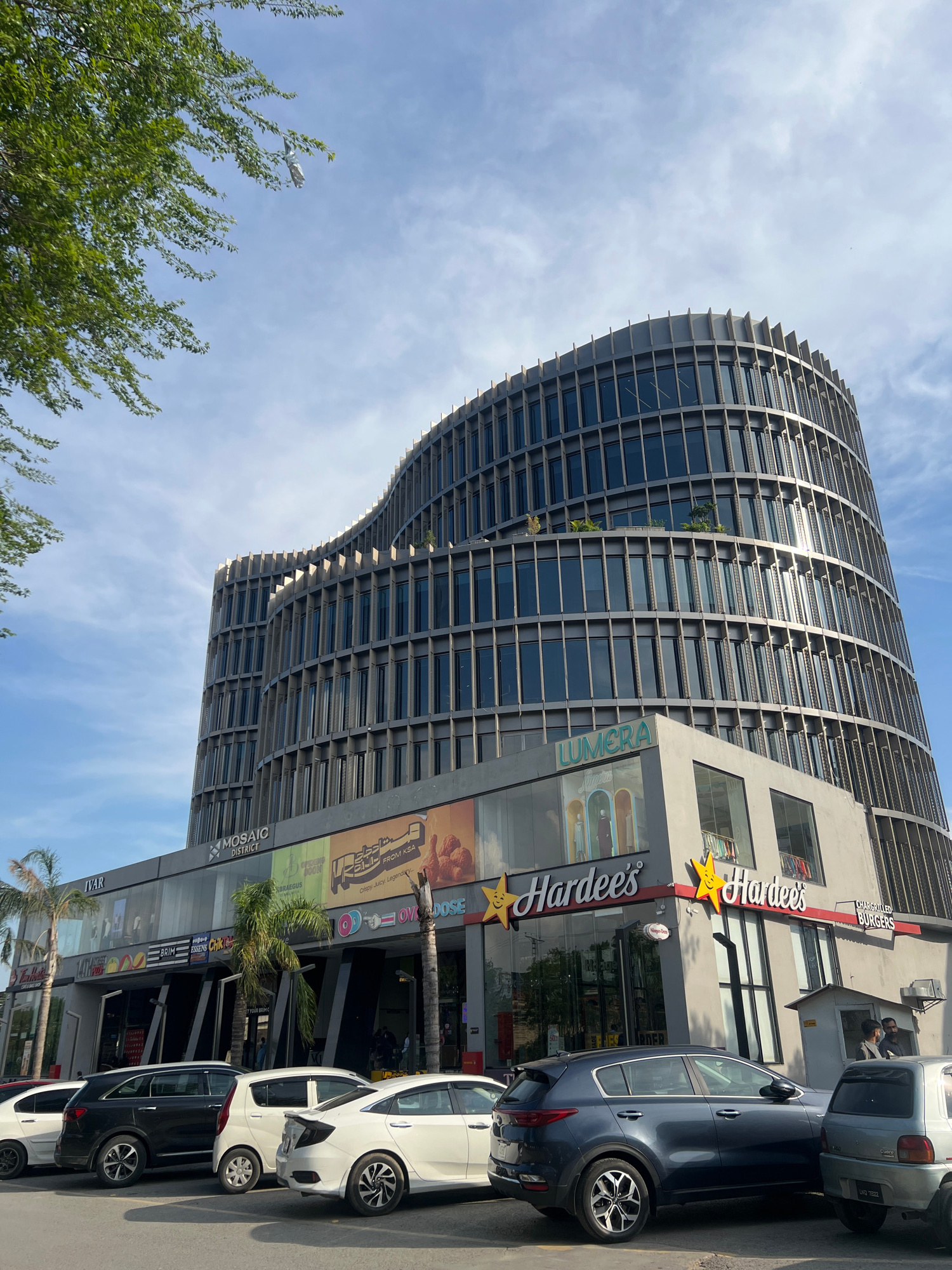 The image shows a curved, multi-story building on a sunny day. The building has a modern design with numerous windows and a metal frame. Several businesses are located at the base of the building, inc…read more