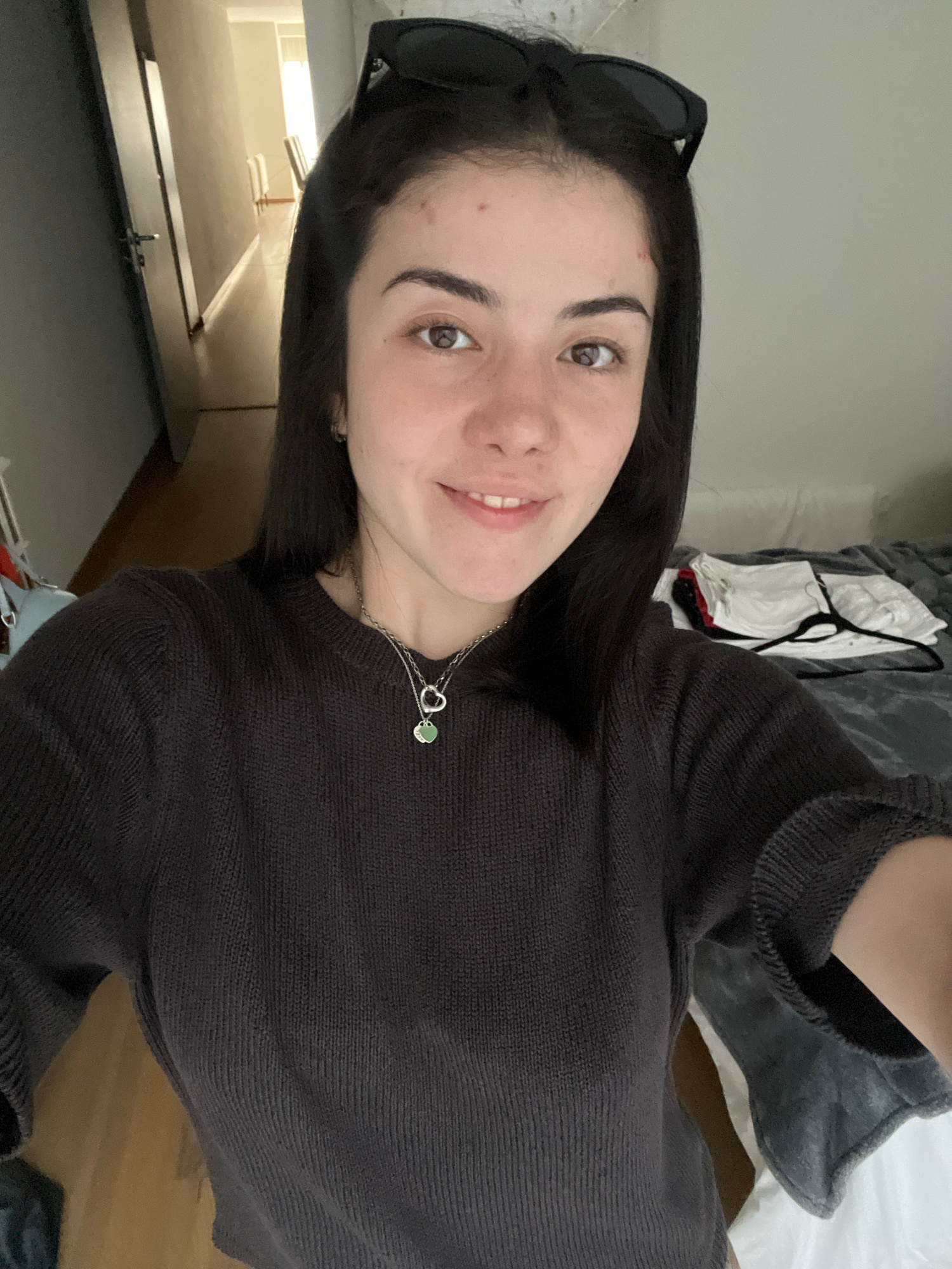 A woman with dark hair and brown eyes is facing the camera and smiling slightly. She is wearing a dark gray sweater and a silver necklace with a heart and a small green pendant. Sunglasses are perched…read more