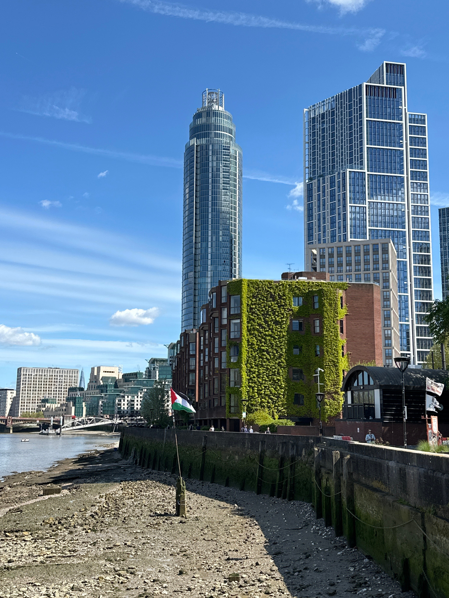 The image shows a cityscape along a riverbank in London, United Kingdom. The camera appears to be positioned along the riverbank, capturing a view of modern buildings. On the left side of the image…read more