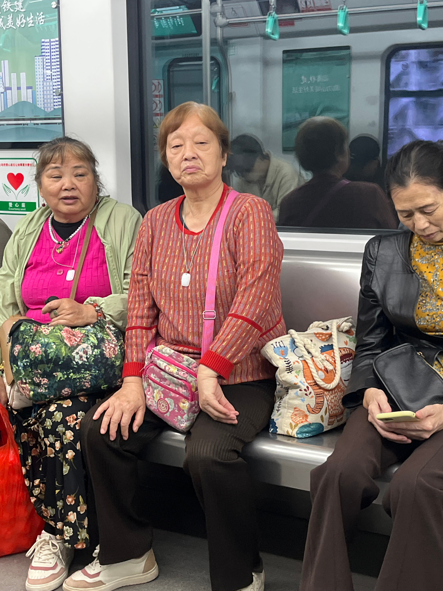 The image shows three elderly women sitting on a subway train. The woman in the front is wearing a pink sweater and a green jacket, with a floral bag and a red plastic bag at her feet. The woman in th…read more