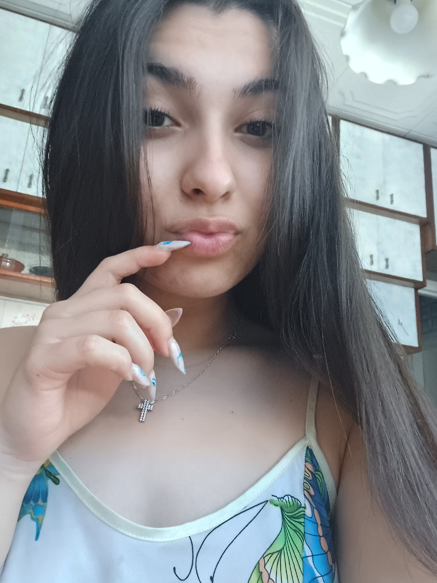 A young woman with long, dark hair poses indoors, possibly in Gorna Oryahovitsa, Bulgaria. She wears a light-colored tank top with a floral pattern and a silver necklace with a cross pendant. Her lips…read more