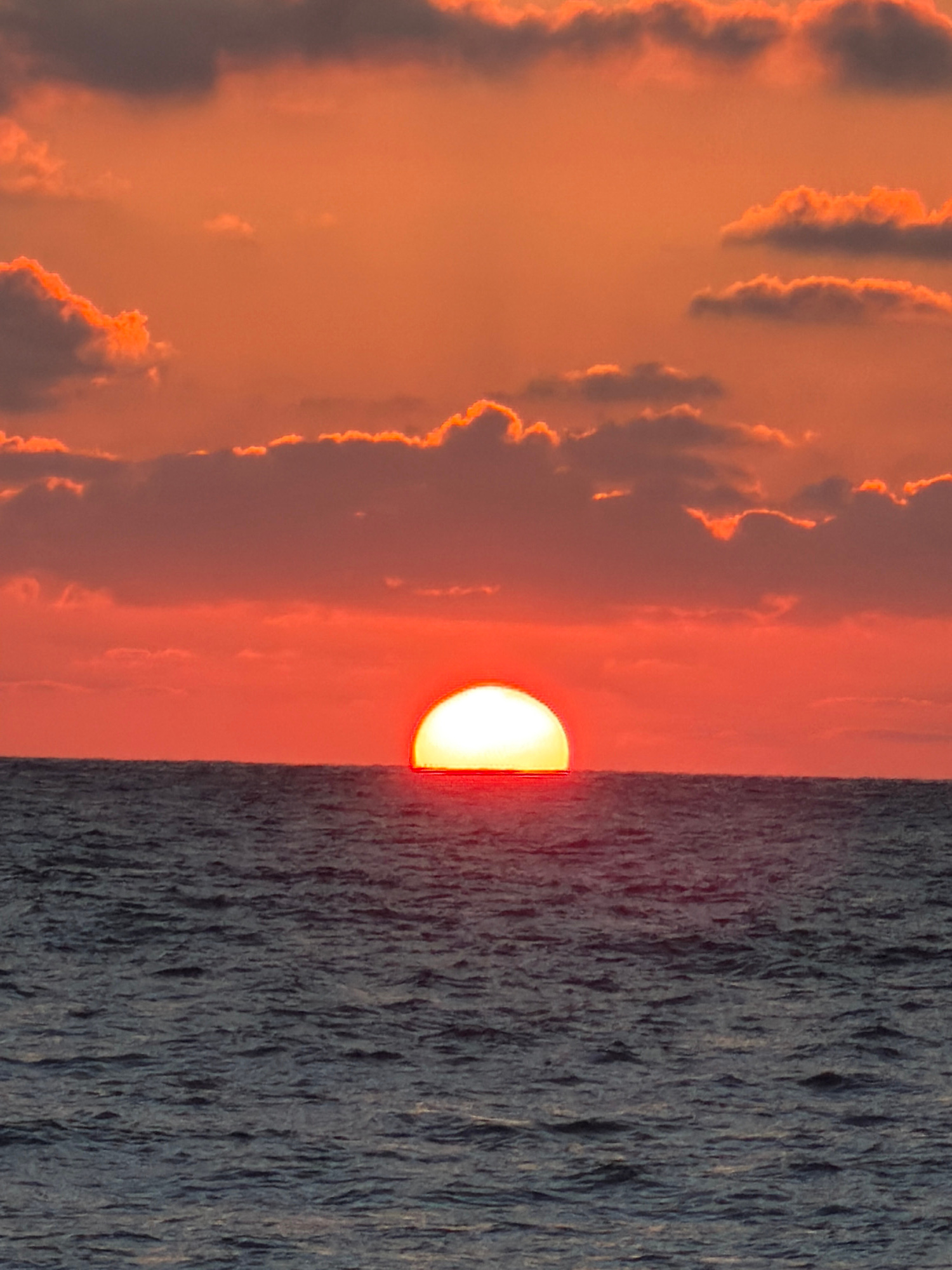 The image depicts a sunset over the Mediterranean Sea, likely taken in or near Tel Aviv, Israel. The sun is bisected by the horizon line, with the lower half reflecting intensely on the water's surfac…read more