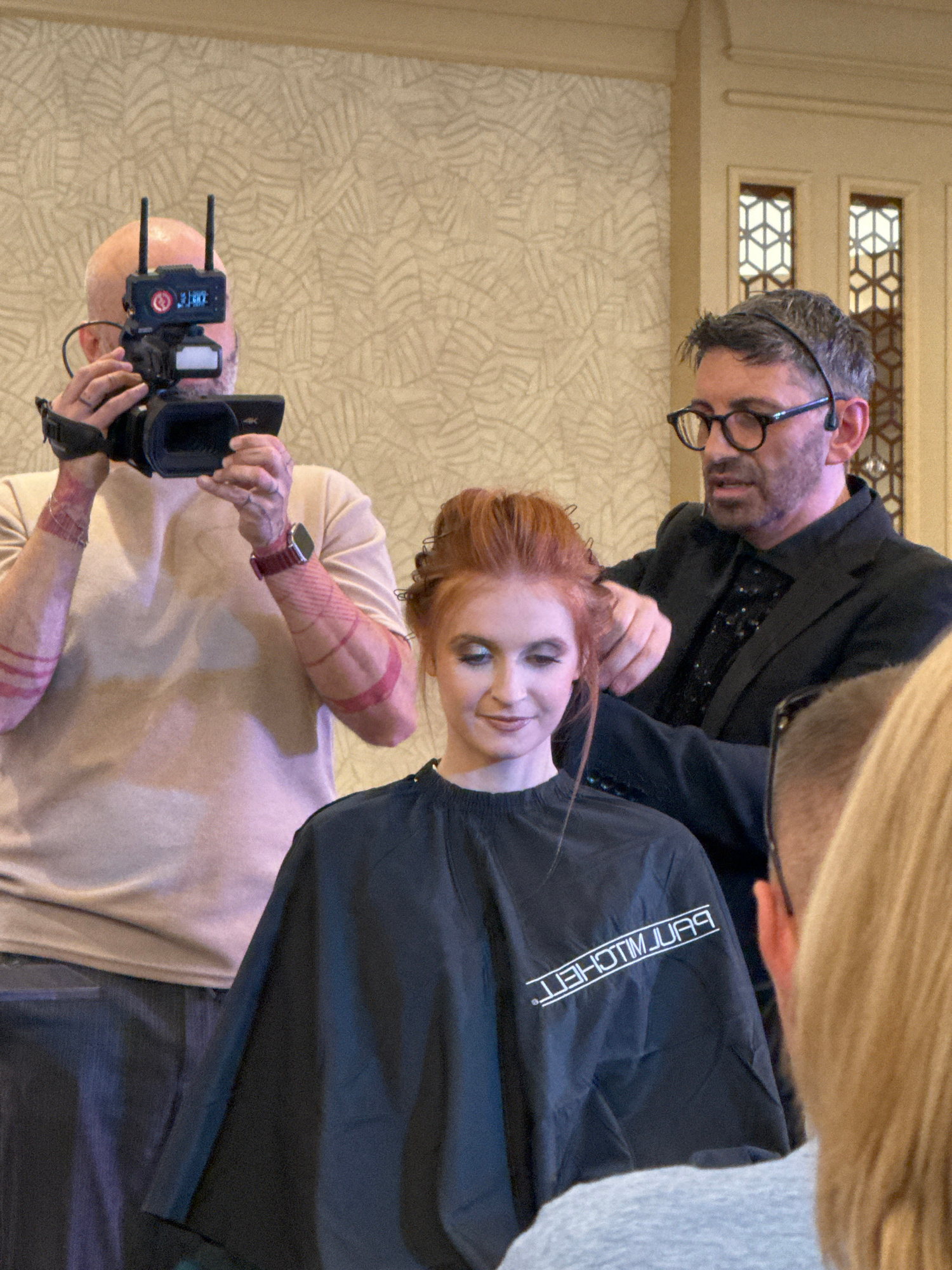 The image shows a man with glasses wearing a black blazer, working on a woman's red hair, who is wearing a black salon cape with white writing on it. Another person, possibly a photographer, is captur…read more