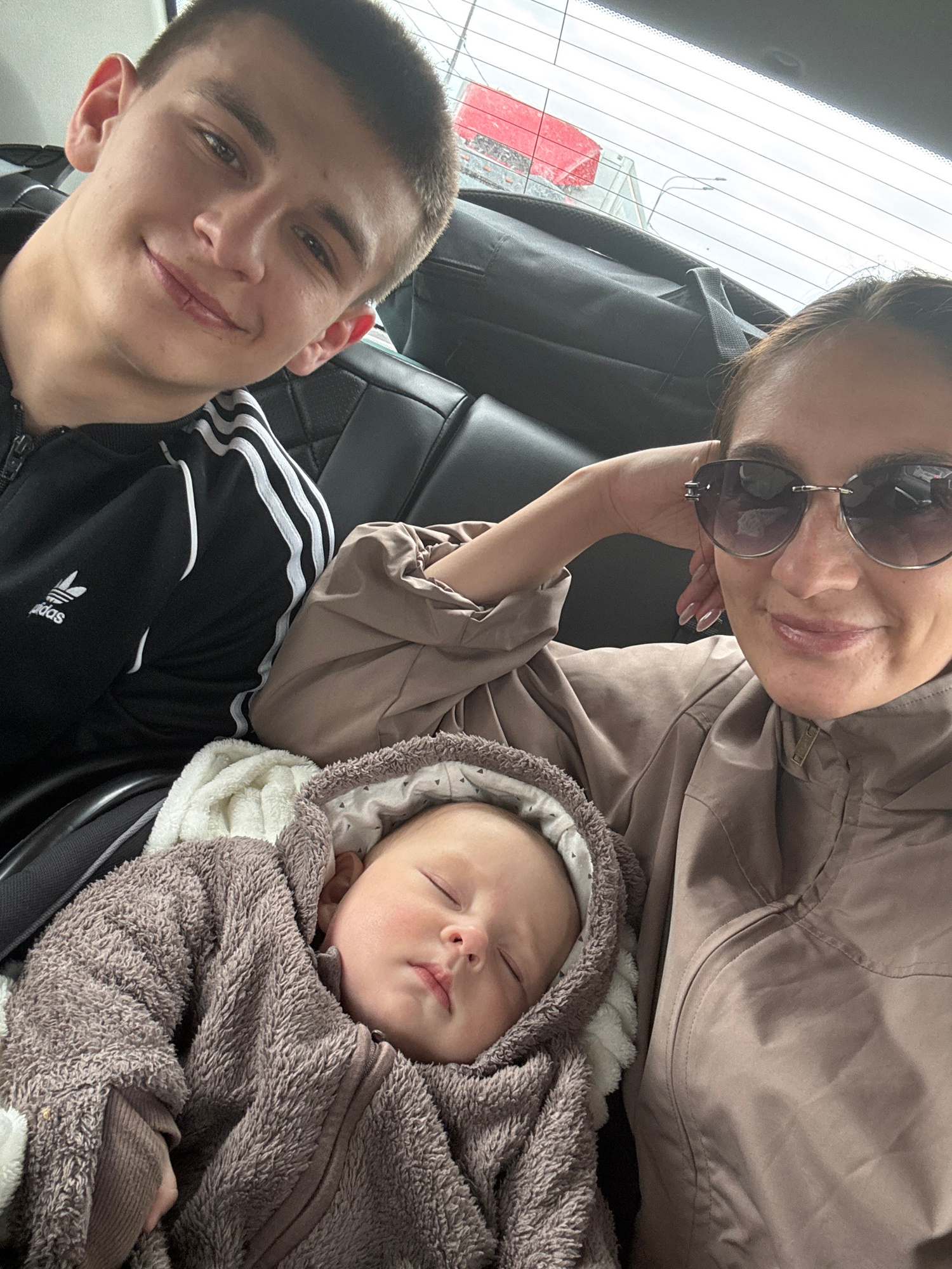 A photo taken inside a vehicle features three individuals: a young man, a woman wearing sunglasses, and a sleeping baby. The young man is seated in the foreground, smiling at the camera. The woman is…read more
