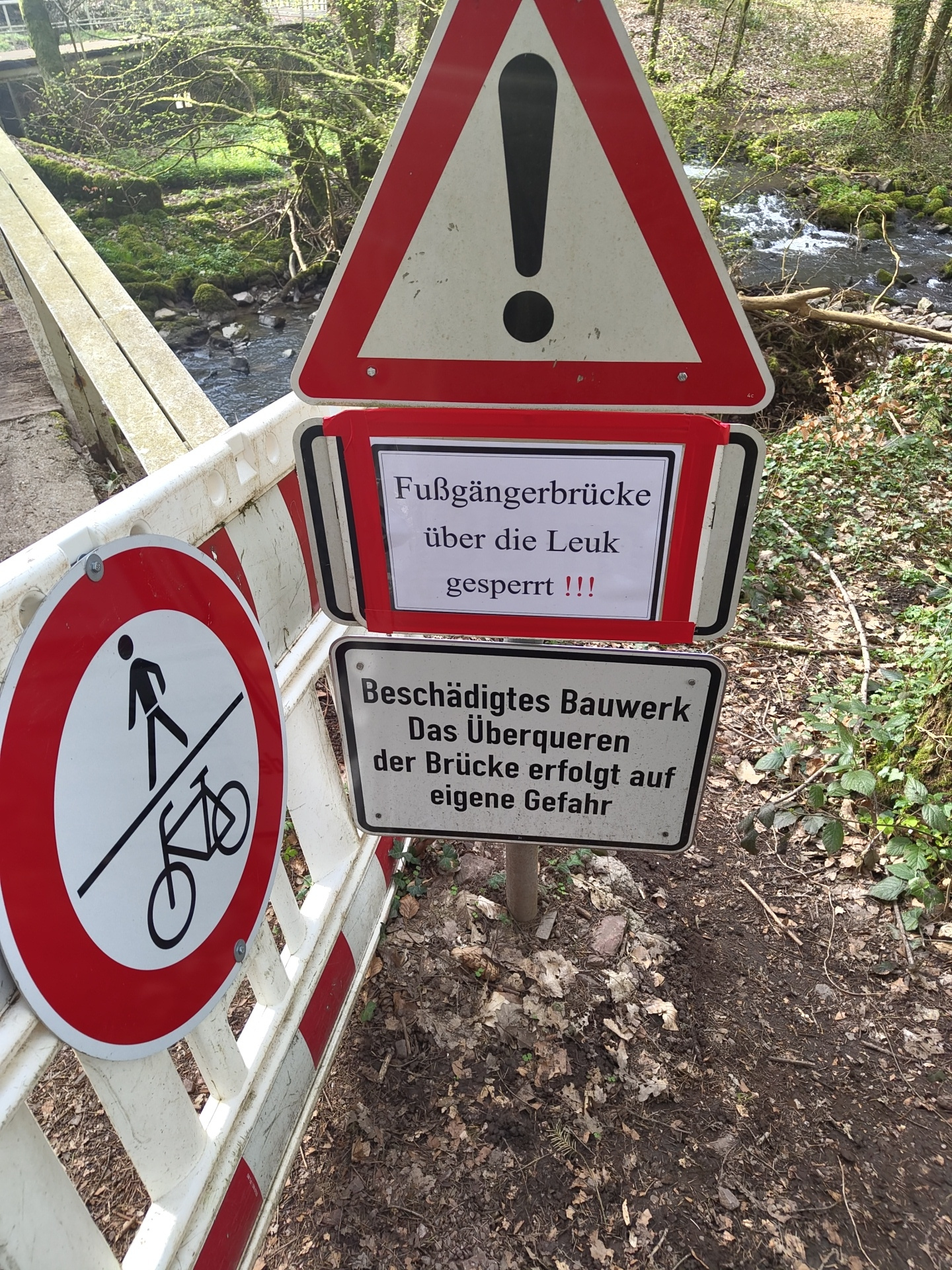 The image shows several German-language warning signs near a stream or river in Mettlach, Germany. The signs indicate that the pedestrian bridge over the Leuk River is closed ("Fußgängerbrücke über di…read more