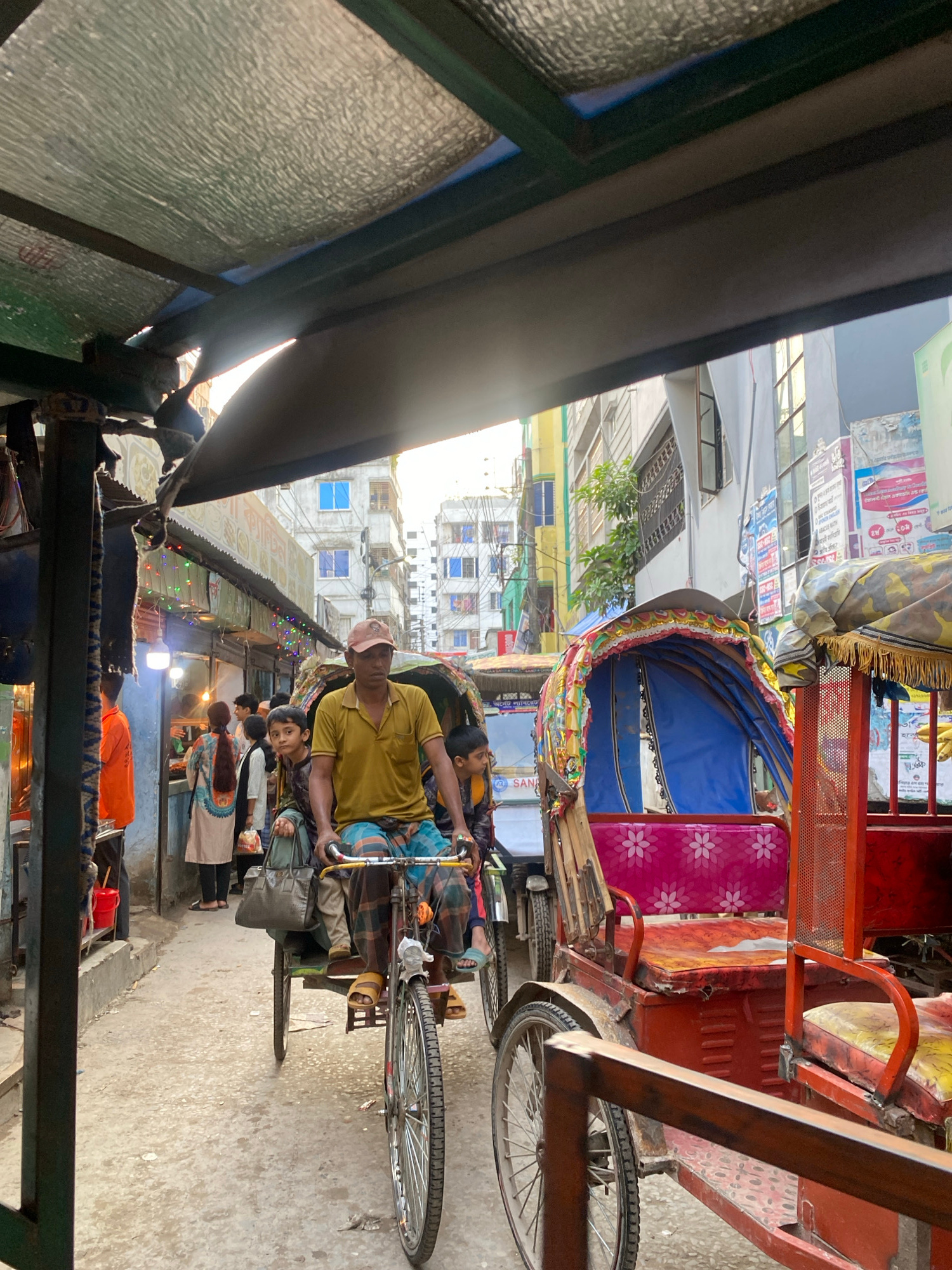 The image shows a street scene in Dhaka, Bangladesh, viewed from inside a rickshaw. A rickshaw driver wearing a yellow shirt and a cap is pulling his vehicle in a narrow street. The rickshaw has a can…read more
