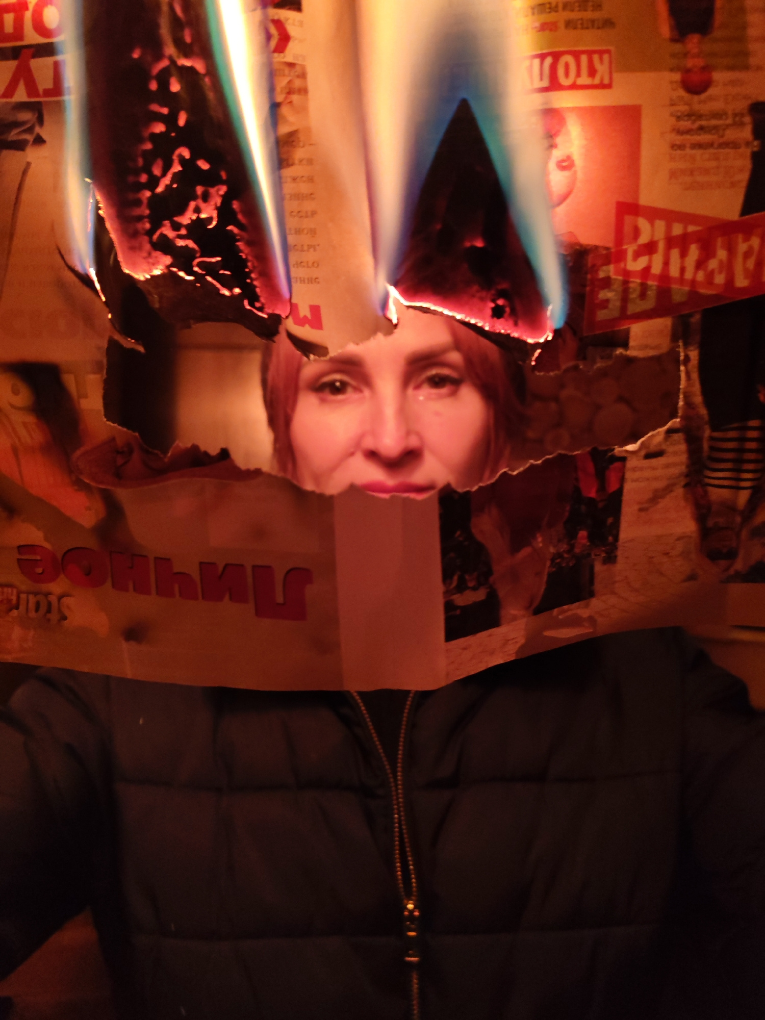 A woman stands behind a burning, torn newspaper. The flames are visible above her head, with the charred edges of the paper surrounding her face. The newspaper's text includes Russian words like "Личн…read more