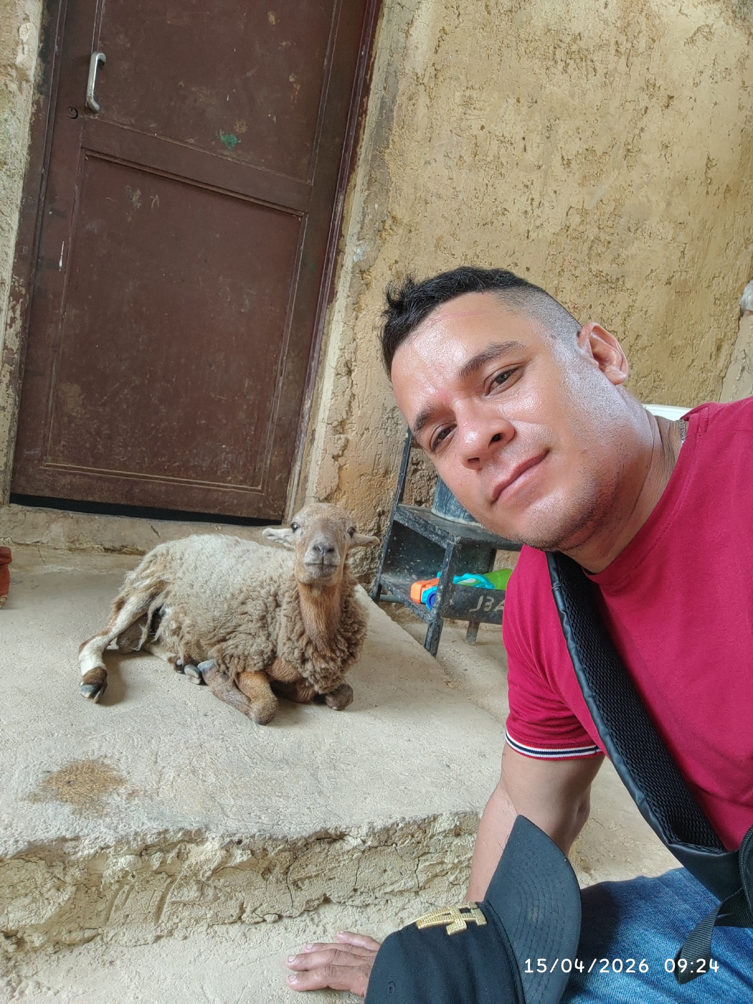 A medium shot shows a man taking a selfie with a sheep in Tinaquillo, Venezuela. The man is light-skinned, with short, dark hair and wearing a red t-shirt, blue jeans, and a black shoulder strap. He'sā¦read more