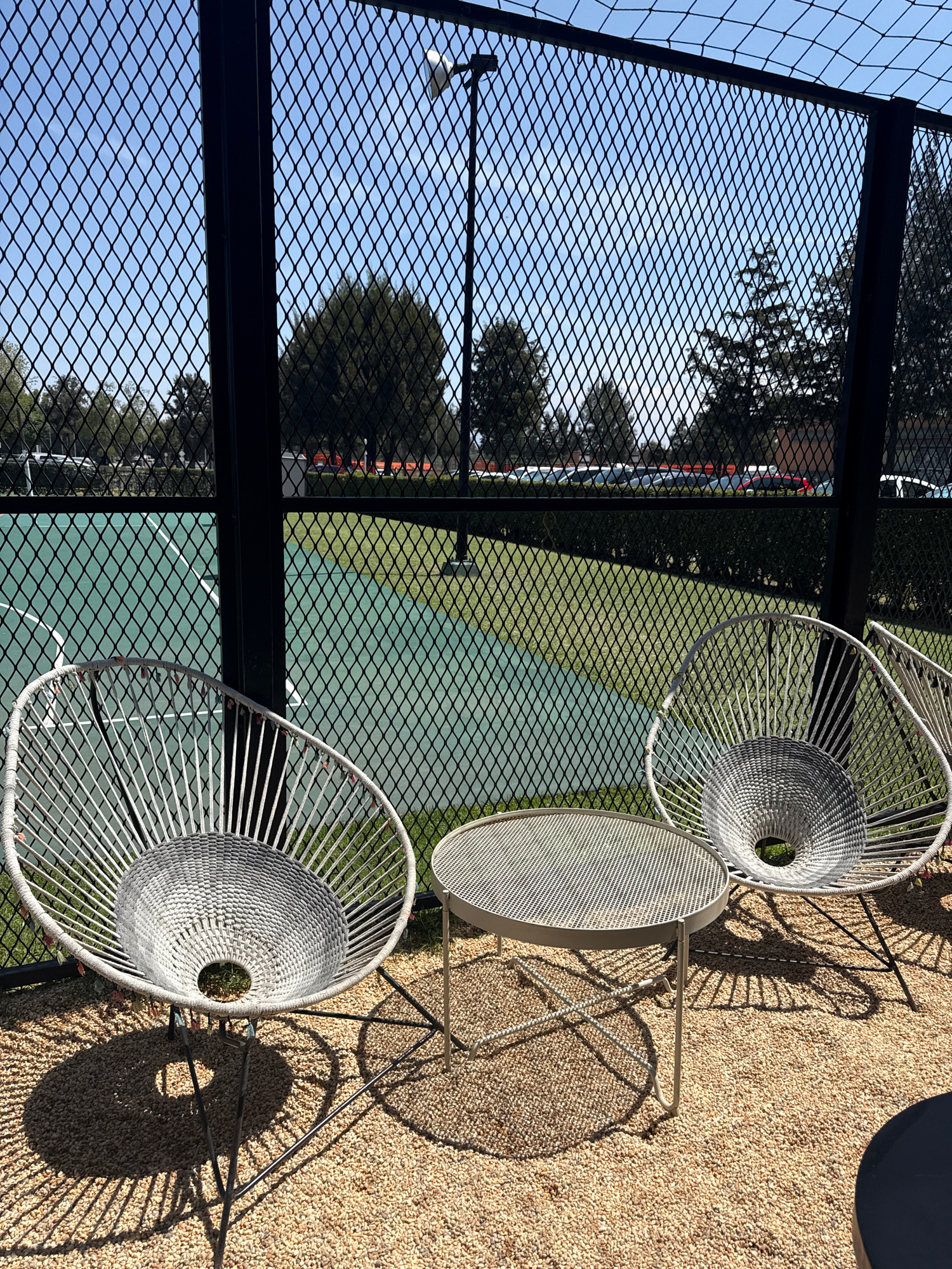 The image shows a seating area with two modern, white, basket-weave chairs and a small, round table on a tan gravel surface. The seating area is adjacent to a tennis or paddle court, visible through a…read more