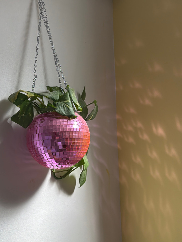 The image depicts an interior room corner. Visual cues to identify a specific location within Tel-Aviv, Israel, are not present. A spherical hanging planter, constructed from numerous pink and some re…read more