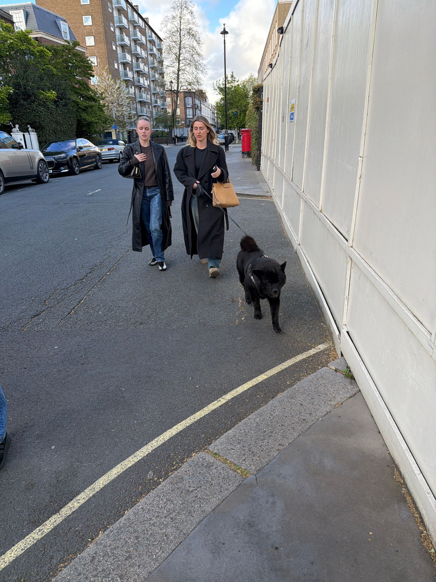 The image depicts a street scene in London, United Kingdom. Two women are walking a large black dog on a leash. The woman closest to the camera wears a brown shirt, blue jeans, and a black leather coa…read more