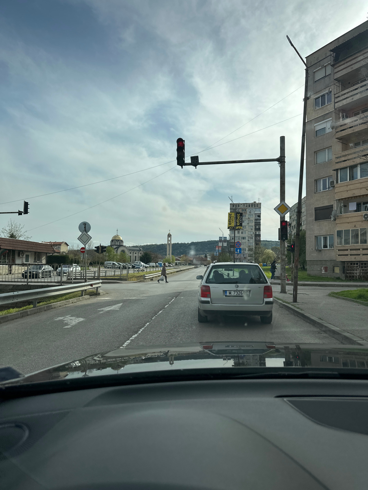 The image depicts a street scene in Montana, Bulgaria, viewed from inside a car. The car is stopped at a red traffic light. Another silver car is ahead, displaying a license plate number "M 7326 PC".…read more