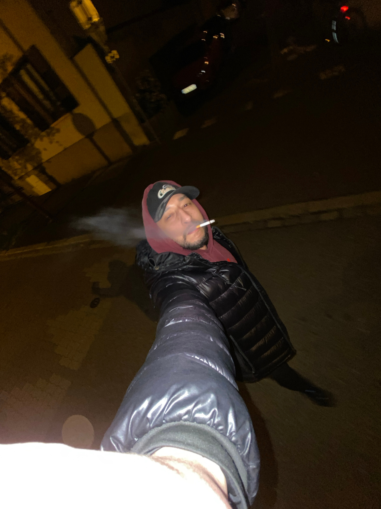 A person, angled from above, smokes a cigarette in an urban environment at night. They wear a dark, puffy jacket and a baseball cap. Smoke emanates from the cigarette. The setting appears to be a cityβ¦read more
