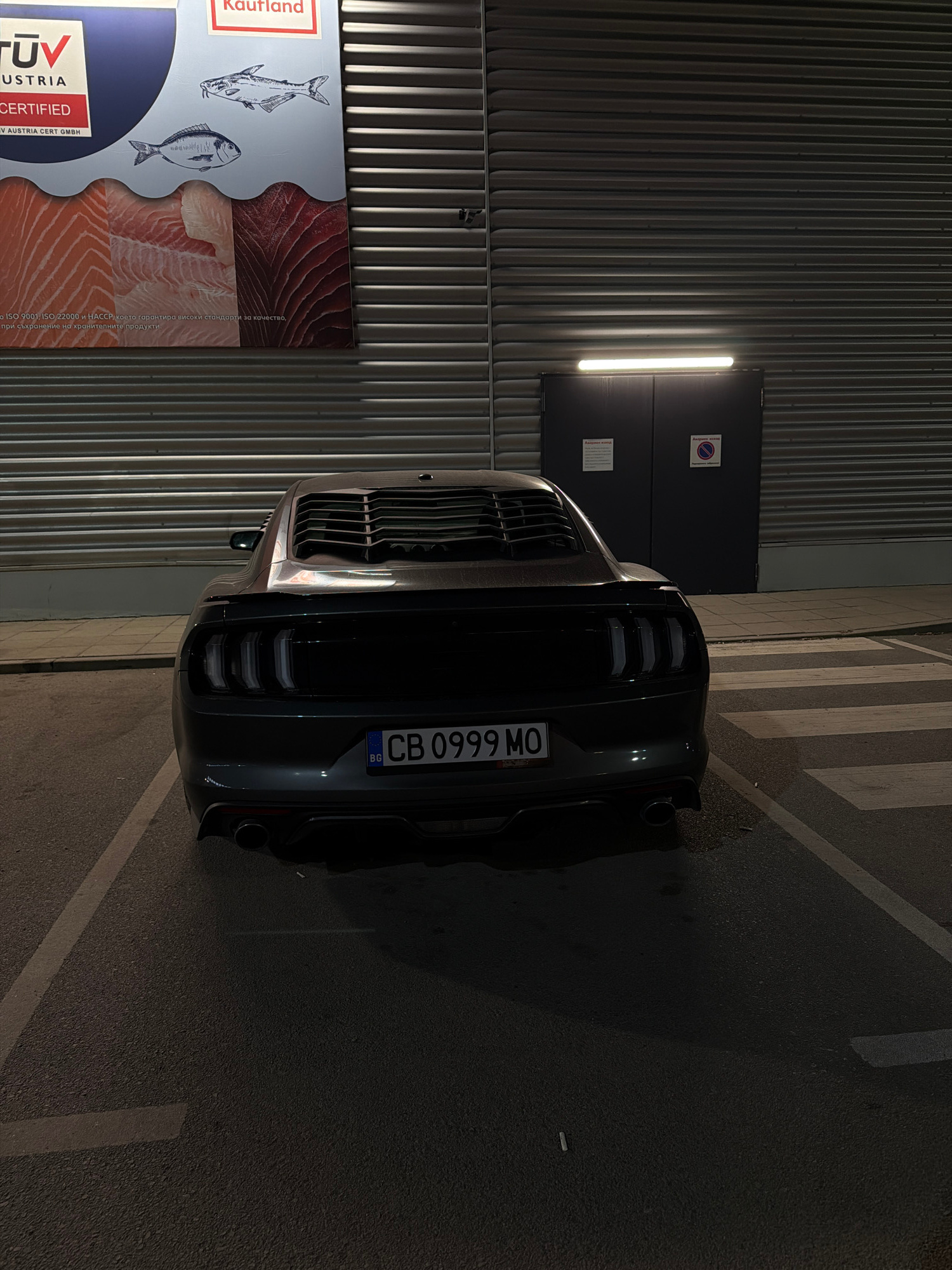The image captures the rear view of a dark-colored car parked at night in what appears to be a commercial parking lot. The car is positioned on an asphalt surface, with white parking lines visible. To…read more