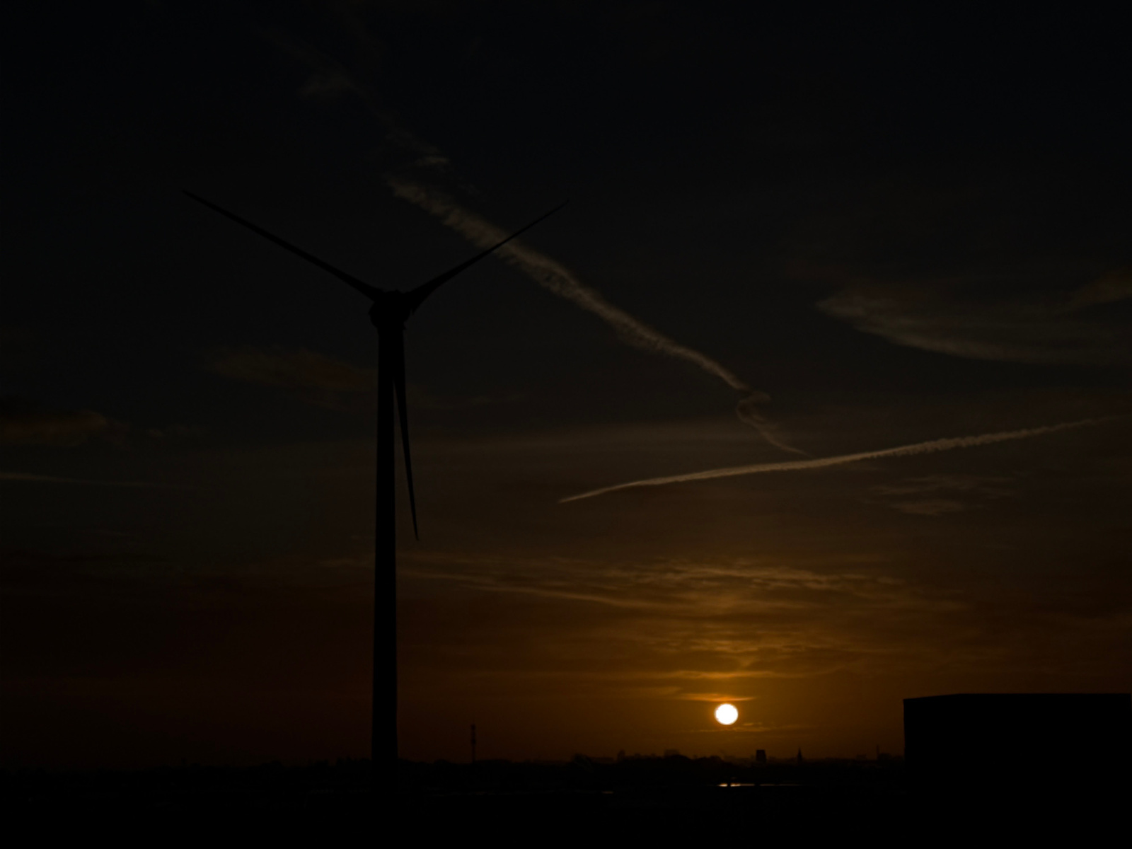 The image shows a silhouette of a wind turbine on the left side against a sunset sky. The sun is visible in the lower center, and there are contrails in the sky. The silhouette of a structure is seenβ¦read more