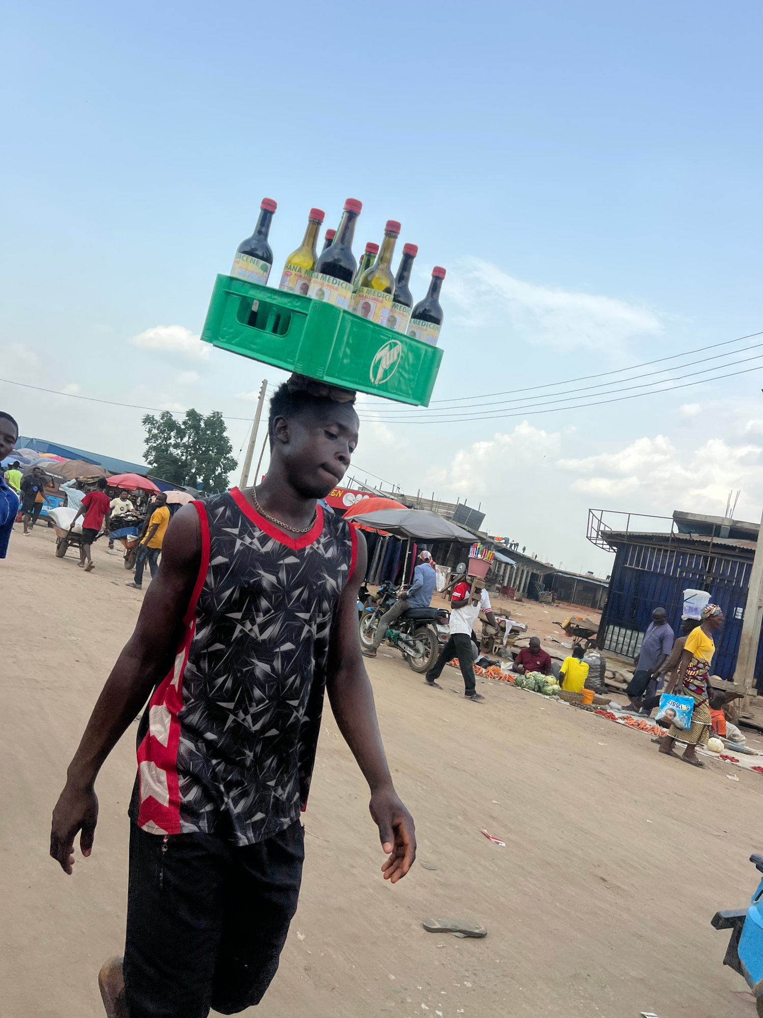 A young man balances a green crate of bottles on his head, navigating a bustling outdoor market scene in Oko Amakom, Nigeria. The crate contains bottles labeled "MEDICERE". He wears a black and whiteβ¦read more