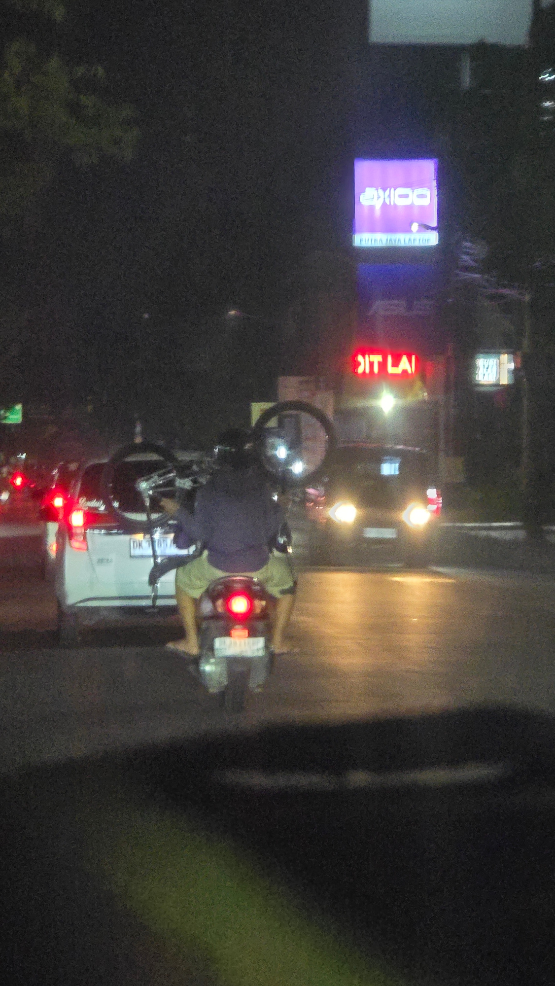 The image, taken at night in Batubulan, Indonesia, shows a person riding a motorcycle on a street. Street signs are visible with the phrases "PUTRA JAYA LAPTOP" and "DIT LAL" displayed on them. The mo…read more