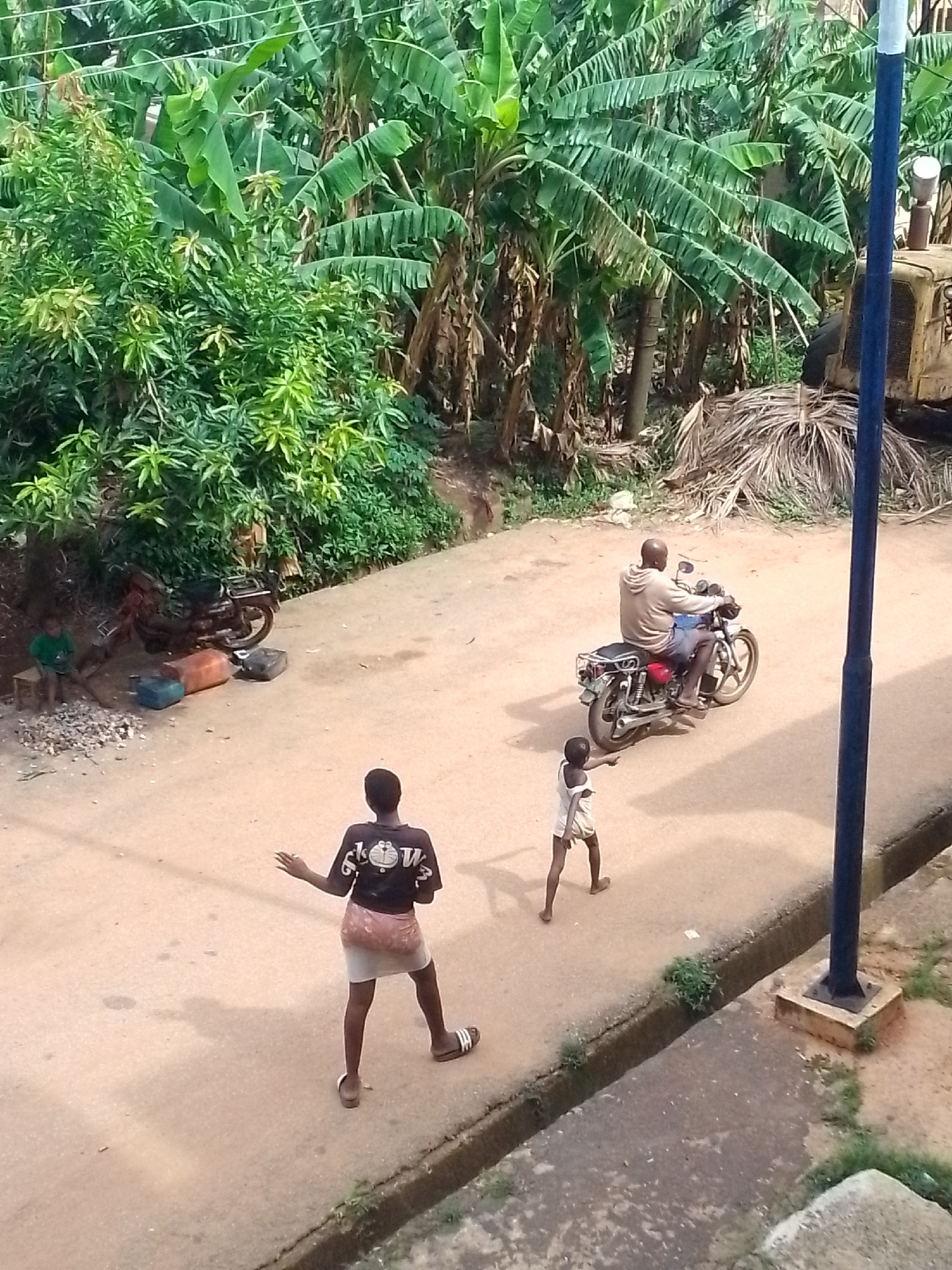 The image depicts a street scene in an unknown location. In the foreground, a person wearing a t-shirt and skirt stands on the edge of the road, with another child walking nearby. In the middle ground…read more