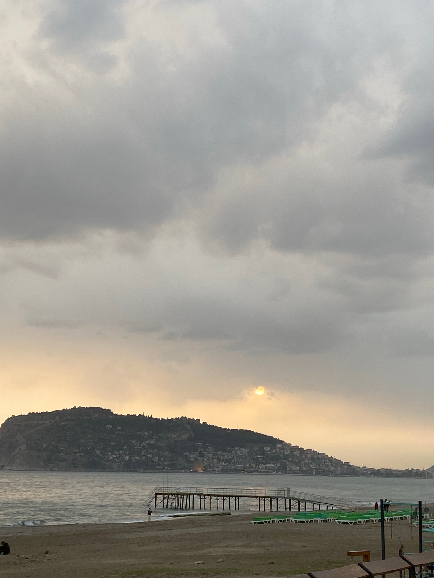The image shows a beach scene in Alanya, Turkey. The sky is overcast with heavy, gray clouds. A faint yellow sun is partially visible through the clouds. A coastline with dense urban development is se…read more