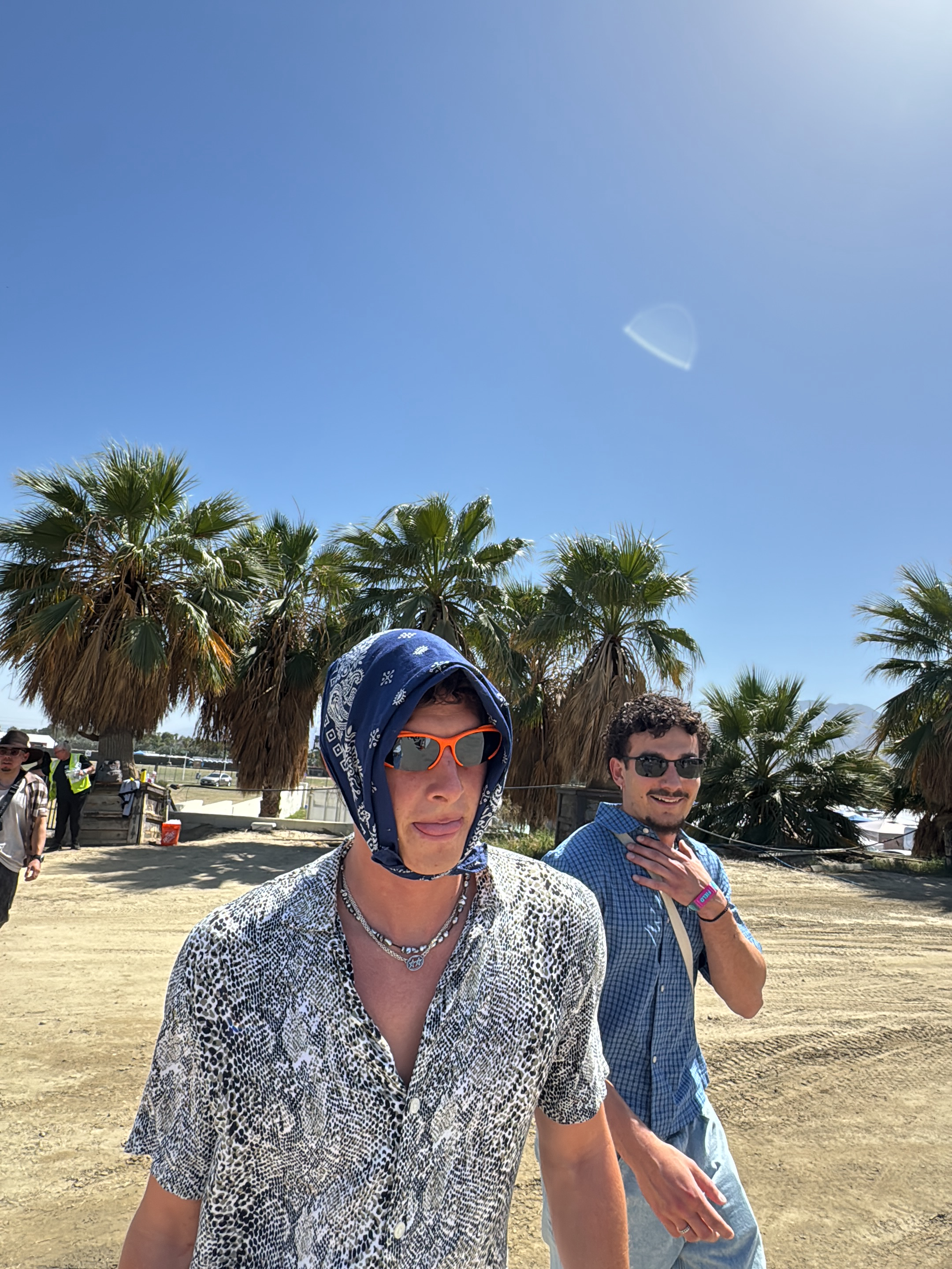 The photograph shows two young men walking on a dirt ground in Indio, California, during daylight under a clear blue sky with palm trees in the background. The person in the foreground is wearing a sn…read more